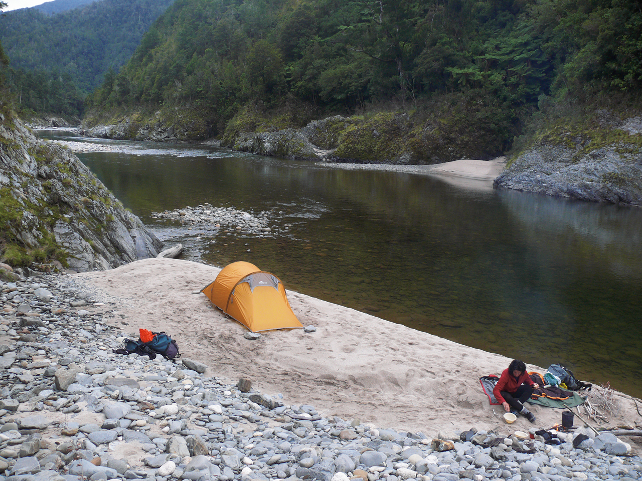 We dropped down to camp on sand by the river, a couple of kilometres up from Rough and Tumble Creek. A driftwood fire, kaka and morepork calling and a still and starry night. Magic.