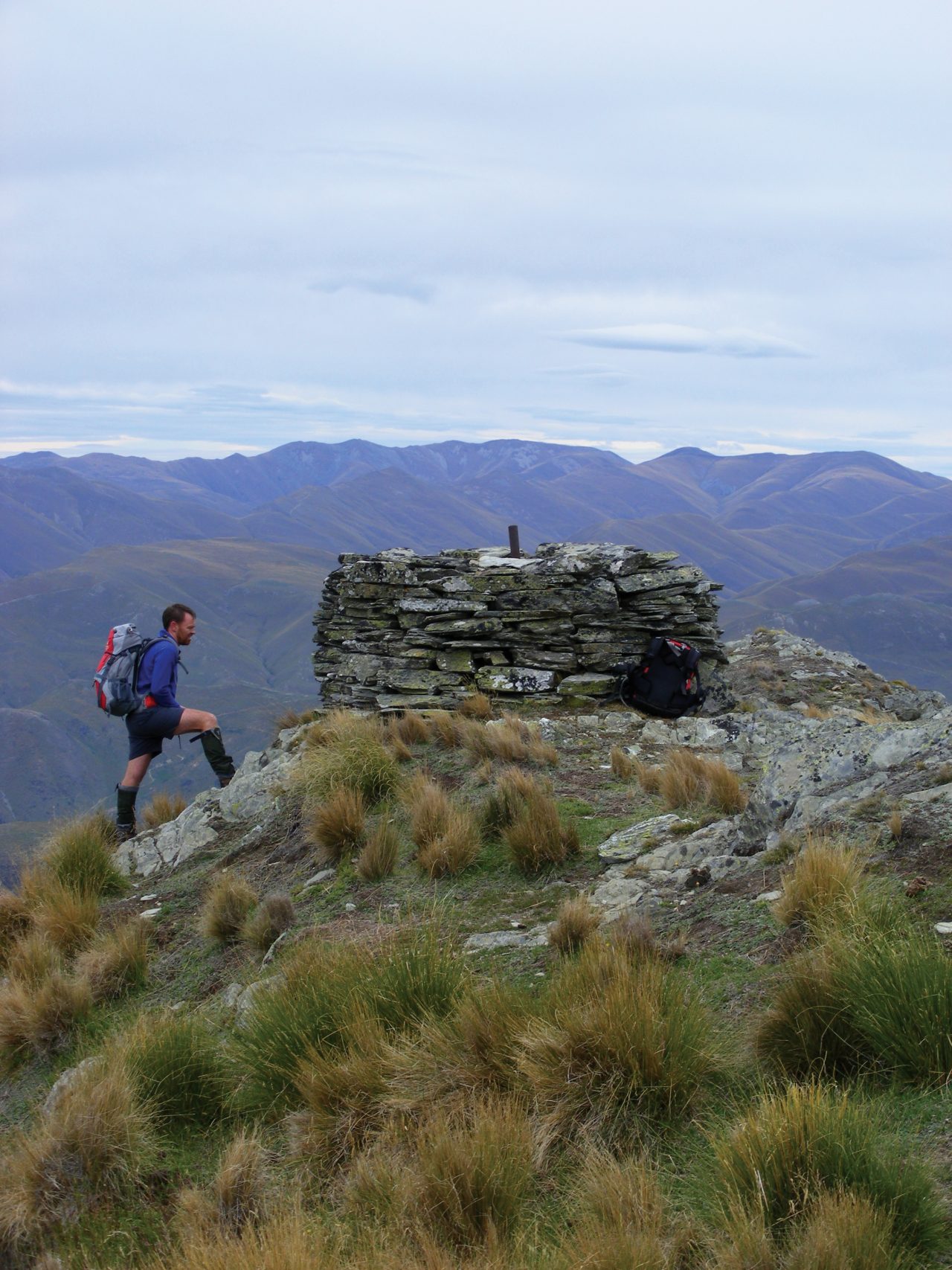 A steeper pitch through a field of spaniards brings us past the false summit and onto the easy ridge that leads us to the top. There’s a massive cairn there. We can see Mt Domett and its neighbours Little Domett, Grayson and Cone. The Waitaki and Hakataramea Valleys lie to the north, but cloud prevents any view of the Southern Alps.