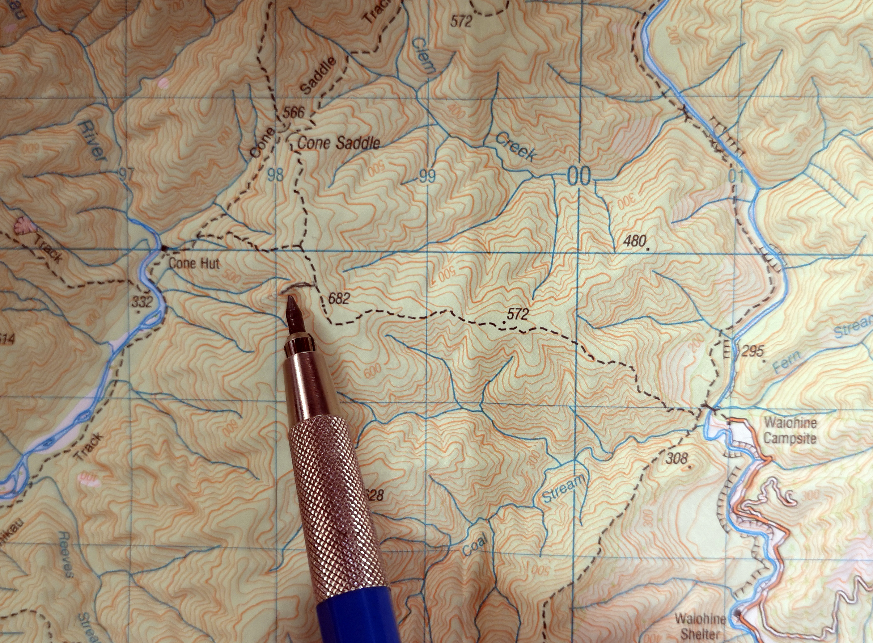 Imagine you are tramping from Waiohine Campsite at the road end to Cone Hut, as shown on the map below. Well-formed animal or hunters’ tracks may lead you to take the spur marked by the pencil. In your head, you confirm this from the direction of travel and the junction, which is on the flatter part of the ridge after Pt682.