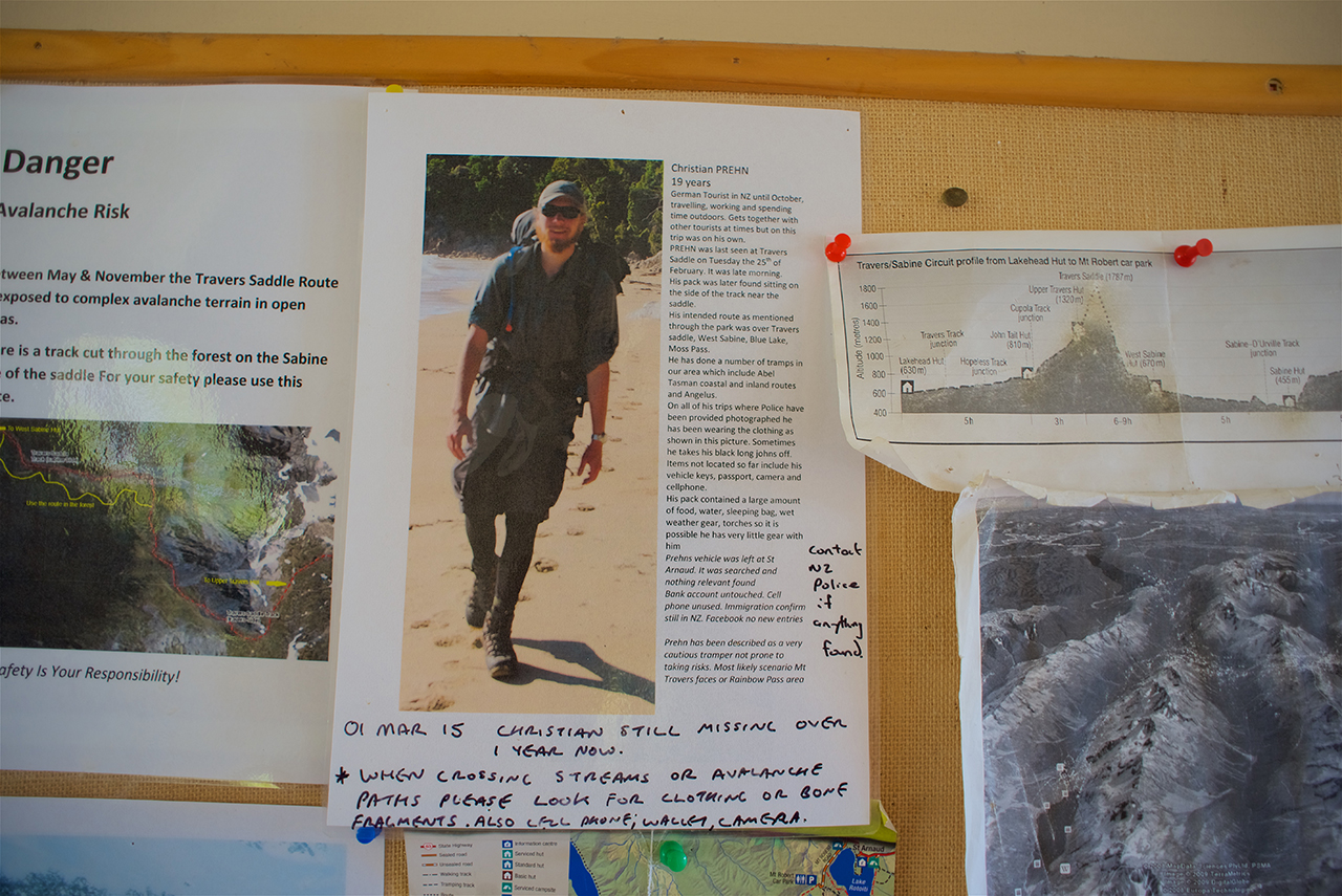 Just an hour and a half from Nelson, the Travers-Sabine is a beautiful, busy track. In the 2013-2014 season, about 5000 people walked it, passing from the beech-lined forest on the edge of Lake Rotoiti and up the avalanche-torn Travers Valley. Five thousand people makes for a lot of footprints. That’s why it’s so hard to figure out how German teenager Christian Prehn disappeared that summer.