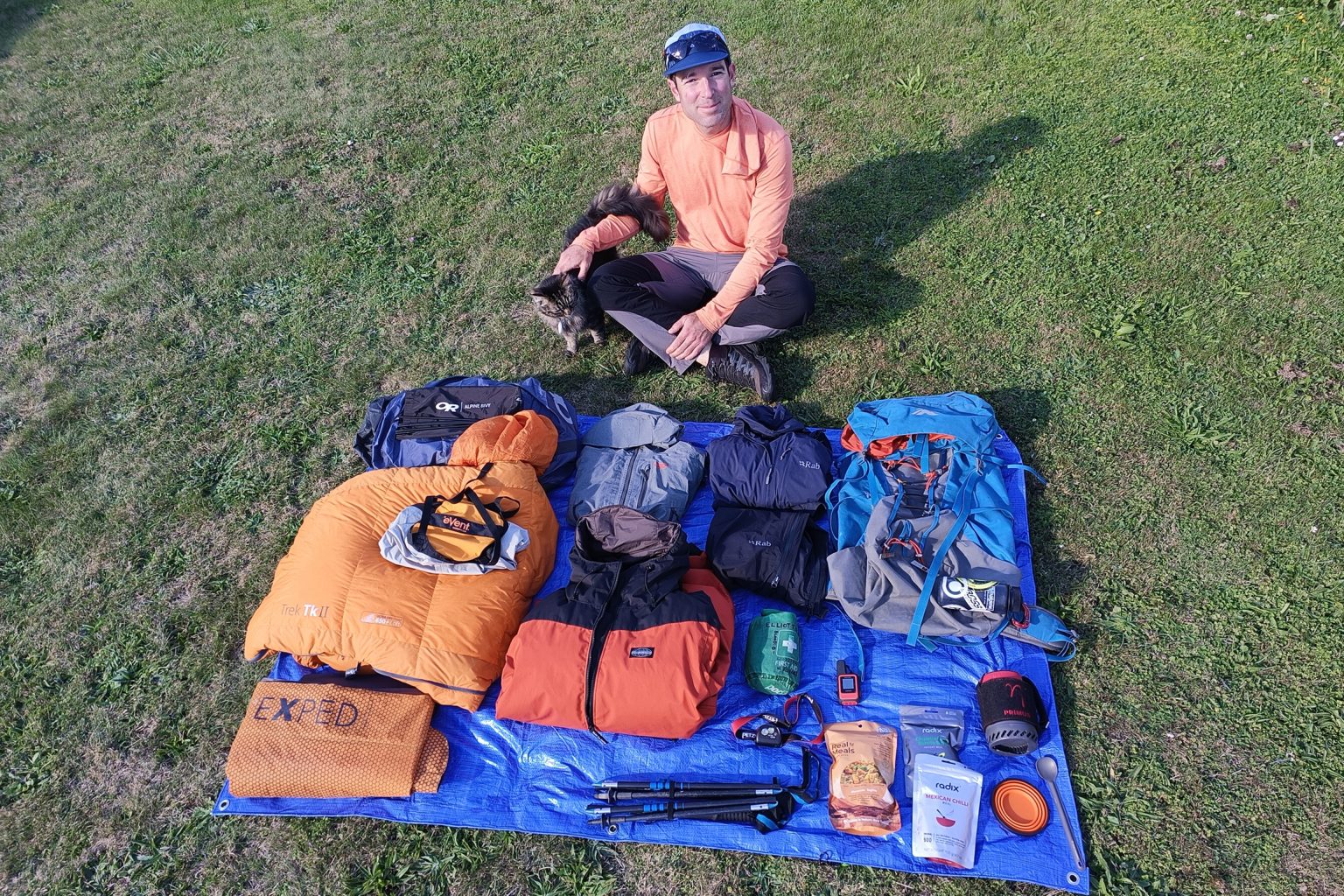 First aid and repair kit, Petzl Actik Core headlamp, Julbo Aerolite Reactiv Cat 0-3 sunglasses, long-handled spoon, collapsible cup, and a fire steel.