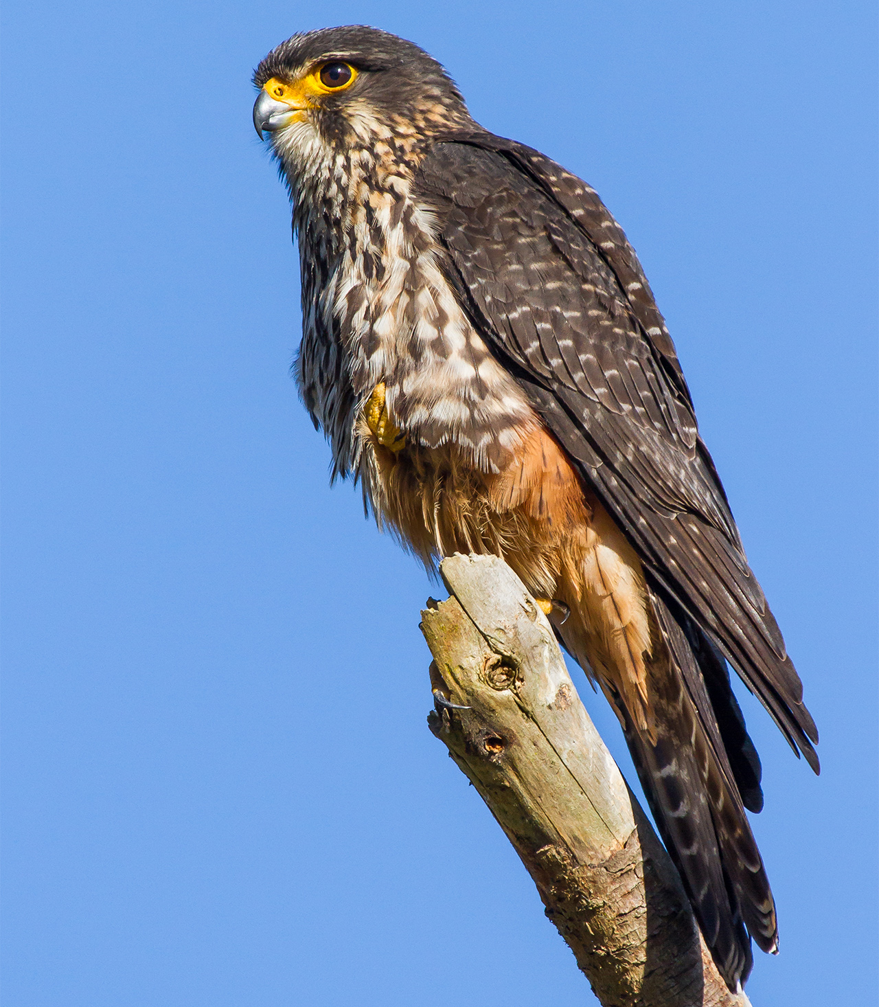 The New Zealand falcon/karearea is one of only four native raptors left in New Zealand. (The others are harrier hawk, morepork and barn owl.) With an estimated 6000 to 8000 individuals, the falcon is classed as ‘nationally vulnerable’.