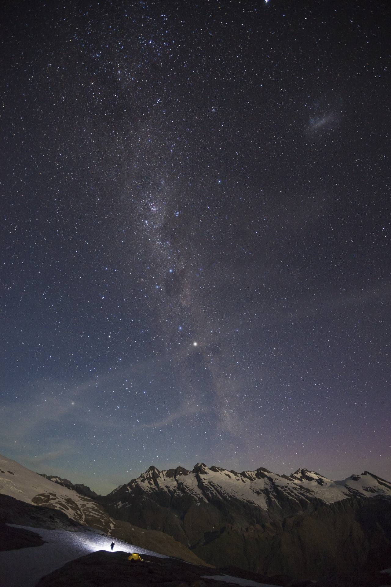 This shot was taken at 9.53pm on Turk’s Head, near Mt Ionia, looking towards Arawhata Saddle and the mountains at the head of the Dart Glacier. Shooting with the aperture wide open and at a high ISO has allowed the camera’s sensor to draw a lot of light from the sky, revealing infinite stars and a sense of depth. A relatively short shutter speed of 30 seconds and a very wide focal length has prevented star trails and frozen the stars in place.