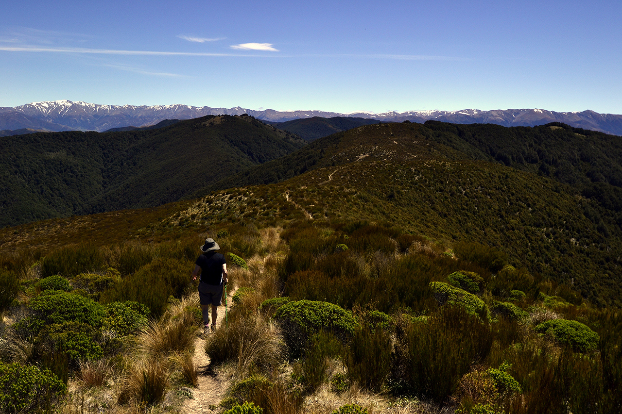 Having refuelled we set off along the Ridge Track, crossing a bush saddle covered with tussock, daisies and turpentine scrub. The track then dove off left and returned to the forest. In contrast to the pine trees of the Summit Track, this section is a remnant of the old beech and podocarp forests that once covered the area and is all the nicer for it.