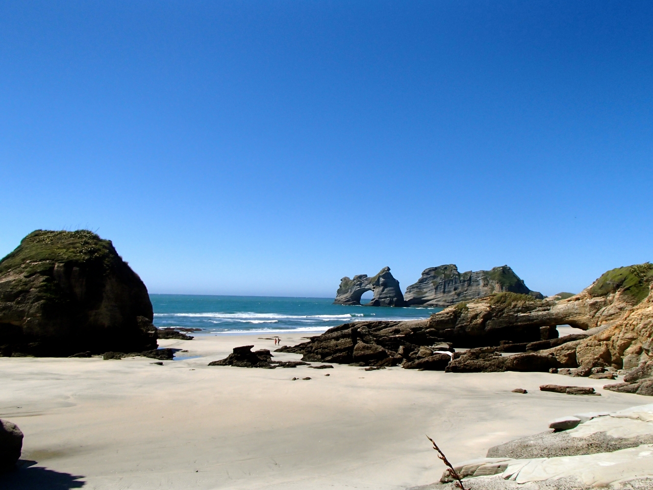 Wharariki Beach is a visual masterpiece. The gigantic scale is the first thing that strikes you after a 20-minute walk across the dunes from the car park. Dead ahead are the Archway Islands – colossal stacks 100m or so out to sea that look even more impressive from the western side of the beach with the angle revealing more arches with angry ocean crashing through.