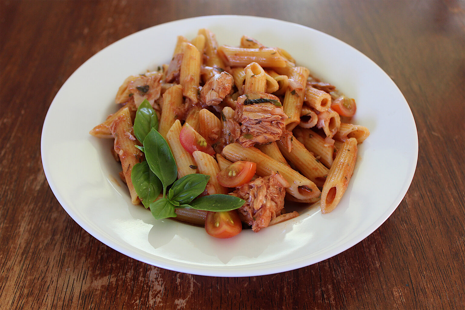 Add the tomato paste and stir. Once the sauce is smooth, add the tuna, olive oil, garlic and onion. Season to taste with mixed herbs. Simmer for another 1–2 minutes to warm all ingredients.