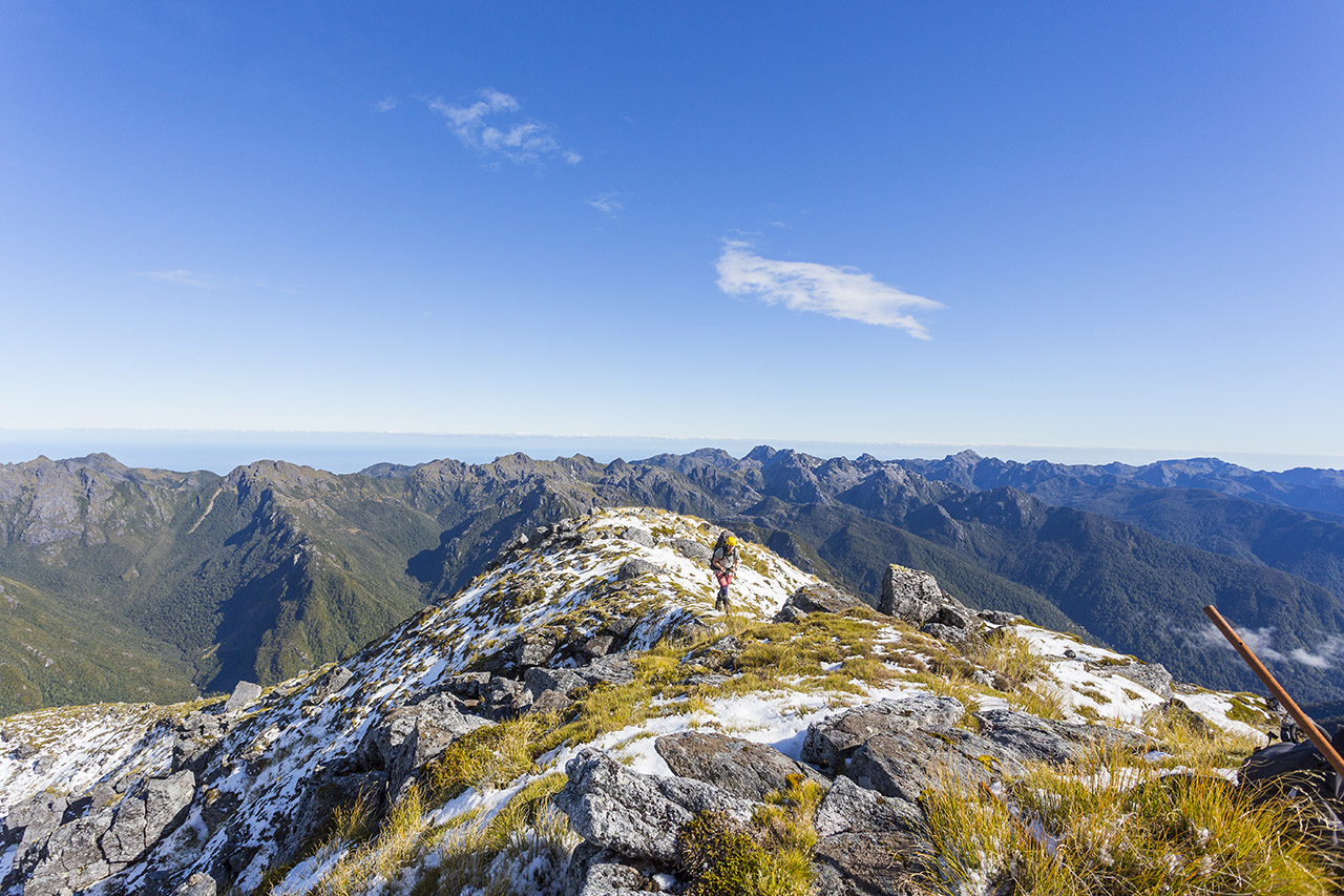 After a large lunch on the western slopes of Stevenson, we struck out on the ridge between Maimai and Giles creeks. It felt right, but as we progressed no track markers materialised and our confidence dwindled again. At this point, after extensive discussion, we settled on preferring to know and to get out that night than to maintain our purist ideals. We pulled out a cell phone and put a call in to Tony, who told us we were on the correct ridge. It’s an incredible piece of track, straddling a steeply undulating ridge through the gnarliest scrub we’d seen yet.