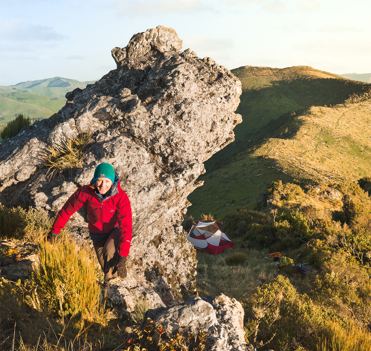 Within four hours we arrived at Mt Fitzgerald and called it a day. We climbed down a narrow outcrop and found a tent-sized spot below an overhang of volcanic rock. It offered shelter and views of a tamed wilderness that is making a slow comeback.