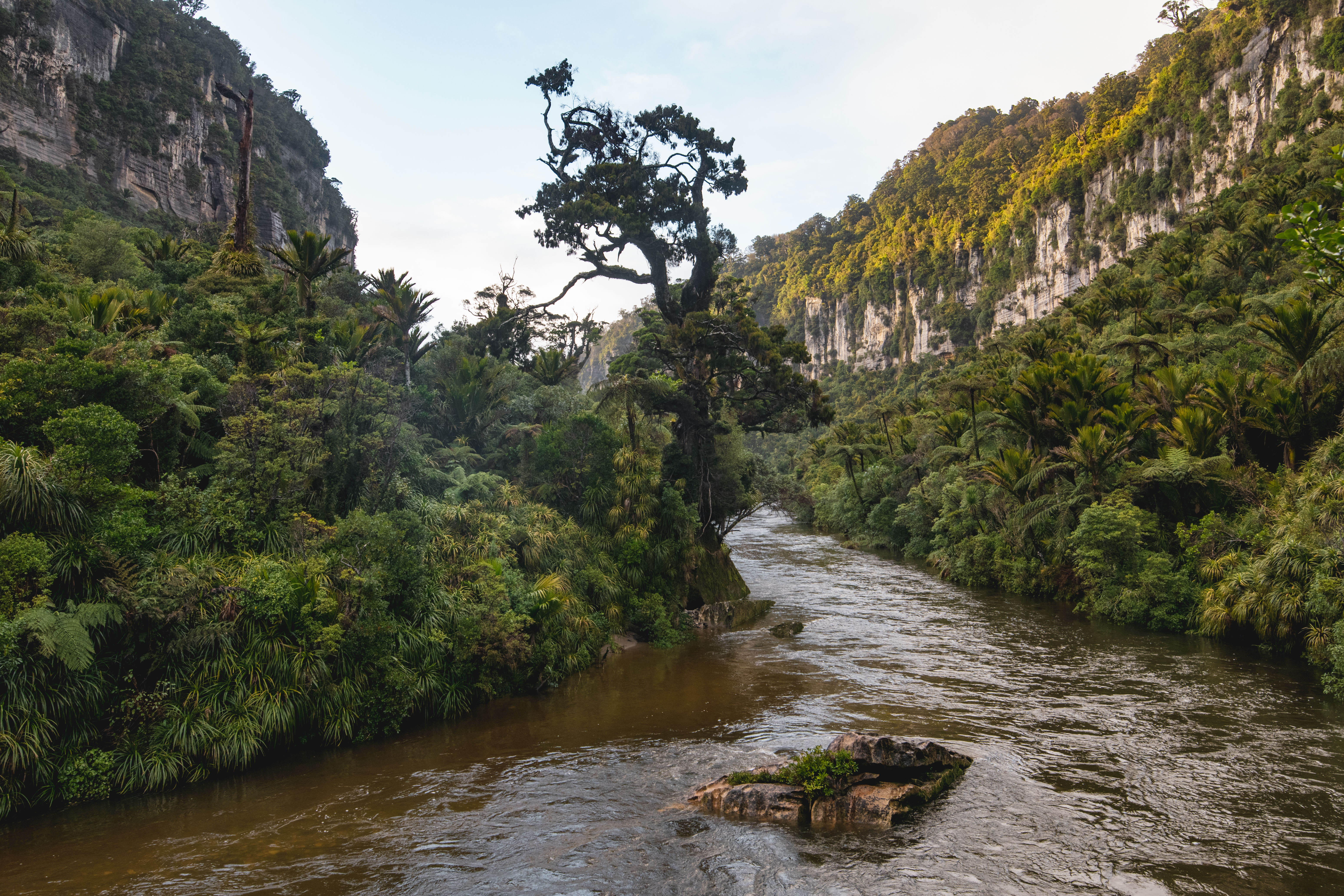 It’s shortly after seven on a cool August morning, and I’m alone on the track, following the Pororari River into its spectacular limestone gorge.