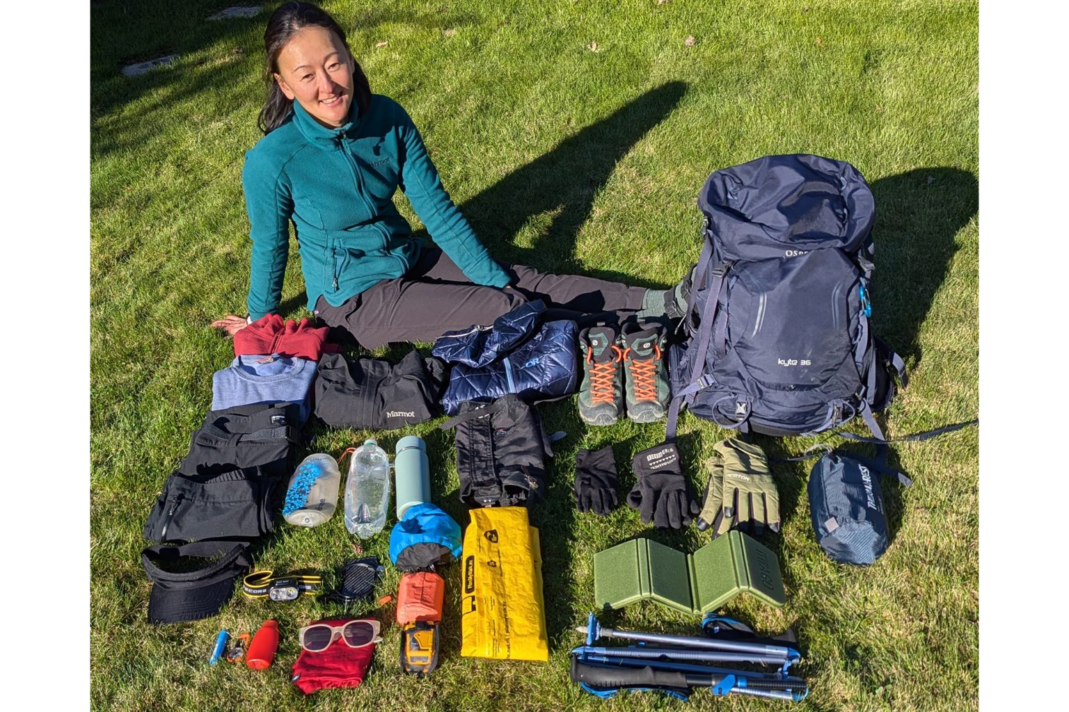 → Equipment Scarpa Mojito GTX boots; Macpac Torlesse gaiters; Black Diamond FLZ trekking poles; Temu sitting pad; Osprey Kyte 36 pack; Gregory Jade 62 pack; MSC pack liner; Nitecore NB10000 Energy Brick; Garmin Forerunner 735XT watch; Decathlon Forclaz mini orienteering compass; Sunscreen, lip balm, poo kit