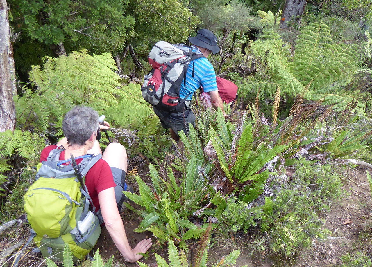 After hauling ourselves back up the ridge but still not finding markers, the decision was made to bush-bash to our next known waypoint. Down into a steep gully, clutching the thick vegetation and then an almost vertical climb up, fighting the forest as we edged closer to our chosen destination. And there, on Huanui (353m), markers were found again with the remnants of a good track.