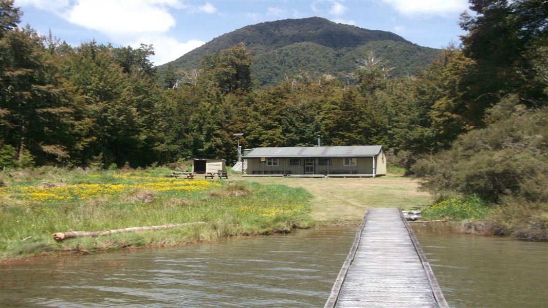 The Manson Nicholls Memorial Hut is a three-hour tramp from Marble Hill Campsite on the Lake Daniell Track.
