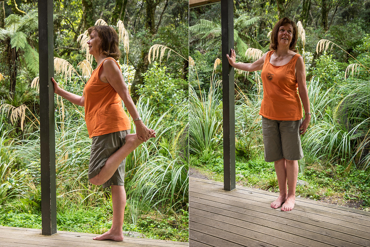 Thigh stretch: Hold on to a post or wall to help balance – unless you want the extra balancing challenge. Reach down with your left hand, bend your left knee, and catch hold of your foot or ankle with your hand. Before you pull with your hand, gently activate or tighten your thigh muscle (or quadriceps) – think of pointing your knee towards the ground. If you need a deeper stretch, gently pull your foot towards your buttocks but keep the knees aligned – don’t let the left knee move backwards. Stretch both sides.
