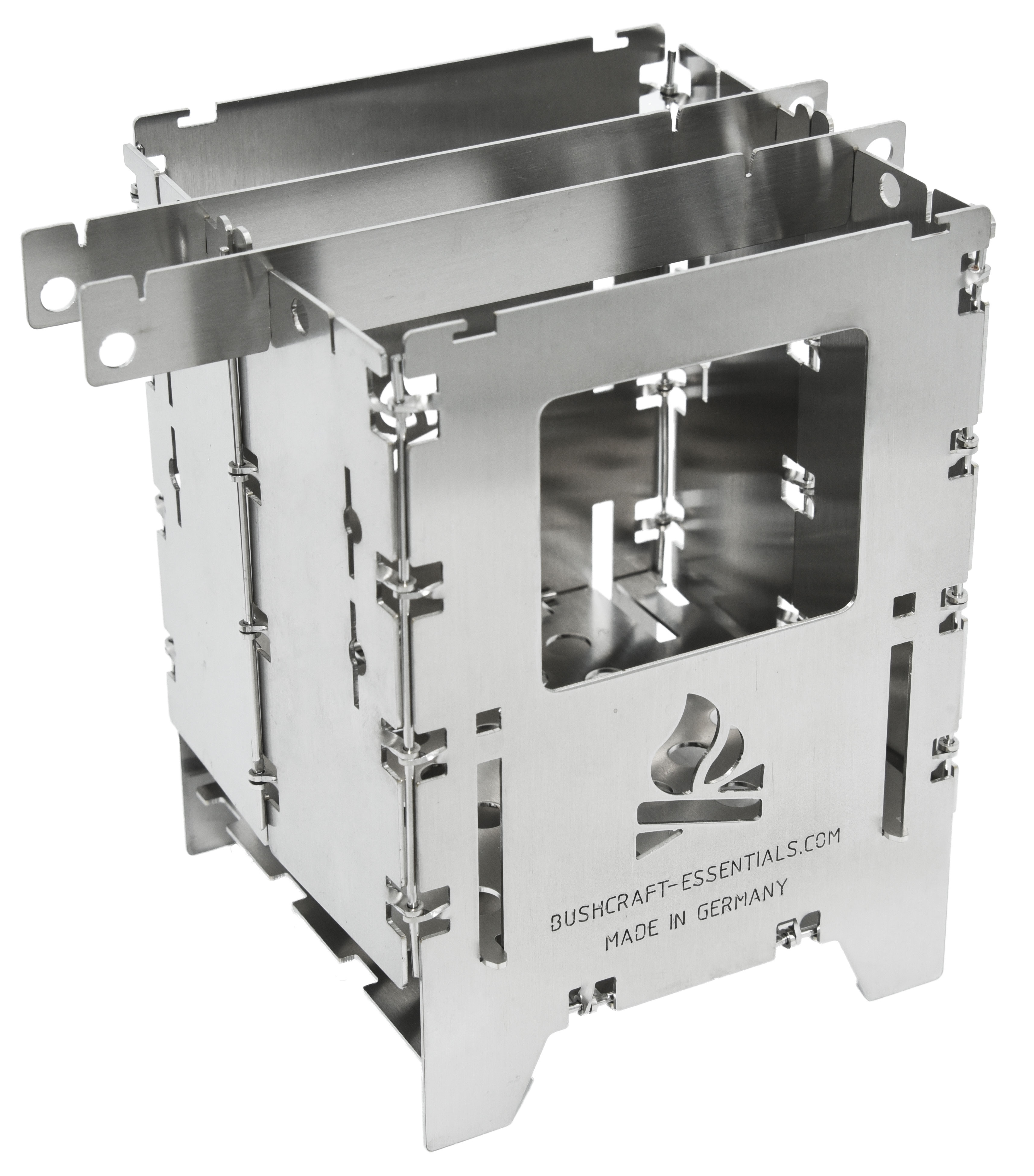 The stove folds flat and fits inside a compact pouch. Two trivets can be used as pot supports and to move the hot stove and to tip ash out without burning yourself. There is a folding base to catch ash and a folding grate on which to place wood. A separate removable grate can be inserted halfway up the stove to provide a platform for Esbit fire starters and liquid fuels.