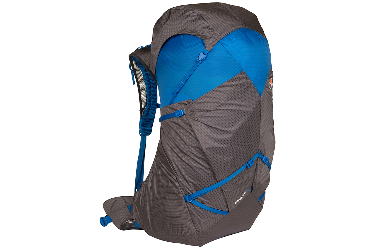 Features: The ultralight Naukan 60 is made of 70D nylon fabric, with an open mesh back panel and aluminium frame. It has an easy-adjust Zephyr-AD back system and Click and Go sternum strap for quick customisation. Two large stretch pockets and two side pockets stash loose gear, and a walking pole attachment quickly secures poles. Hydration compatible.