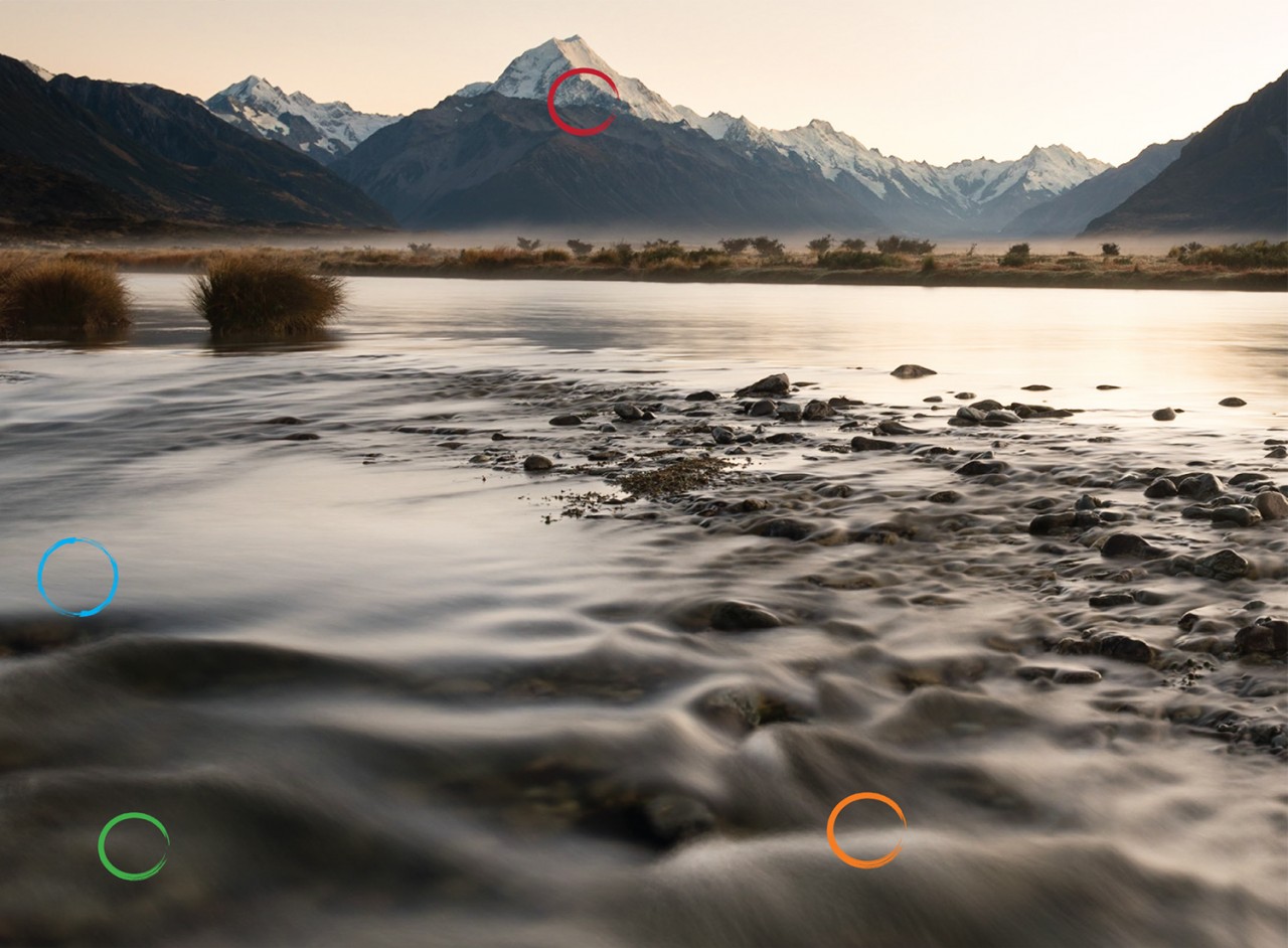 Photographing upstream with the water coming towards you normally works best, as it draws your attention into the photograph, not out of the photograph. Use the shape and flow of the river to lead you into a background subject, such as a distant peak or a prominent feature such as an overhanging tree. Sometimes shooting directly across the river to a subject on the opposite bank can work really well.