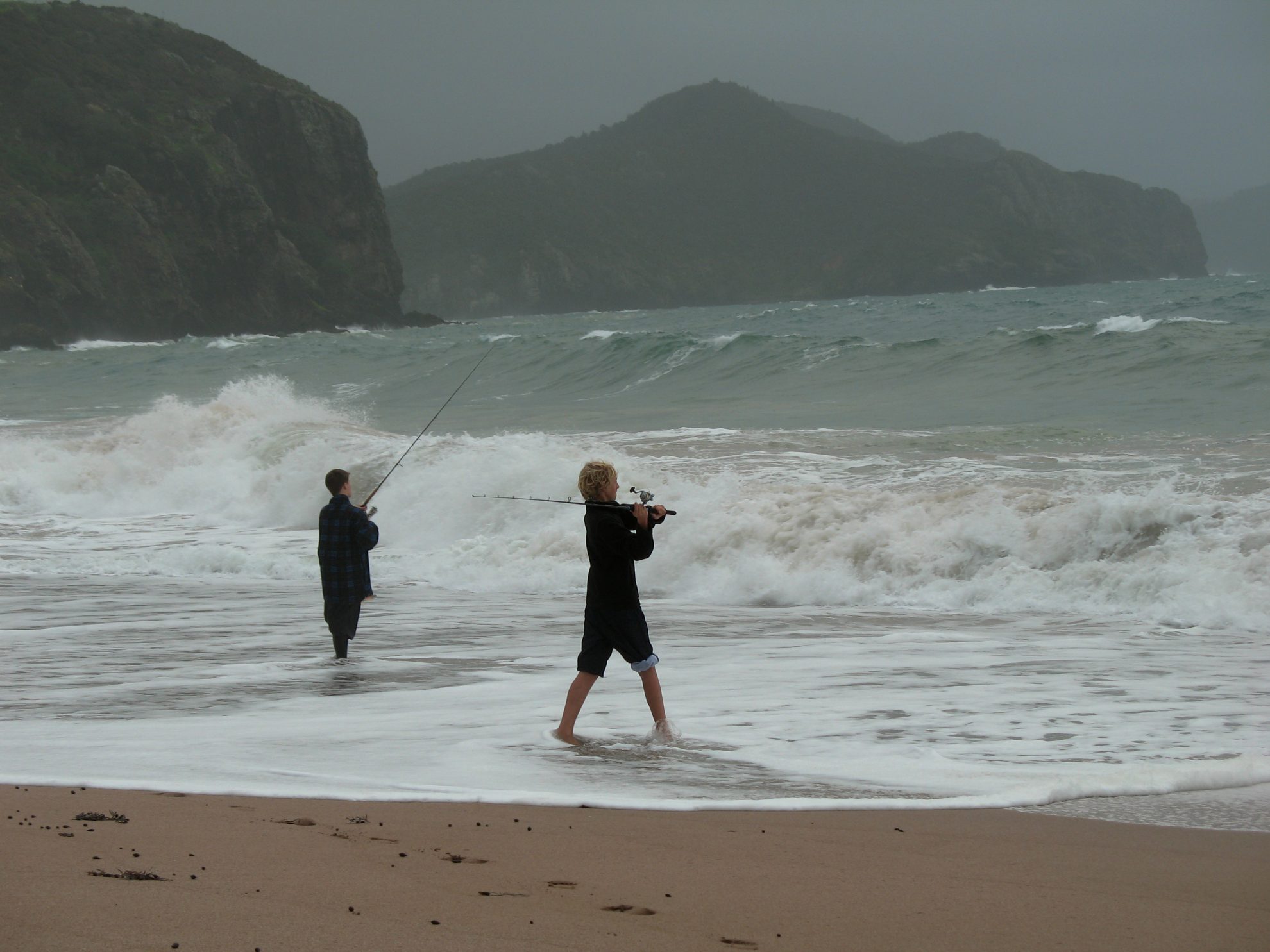 The boys switched from kayak fishing to surf-casting with their wee rods, and still caught fish. The surf crashed and roared that night: it was great being camped so close, but safe and snug in our tents. Sunday’s 60 knots and constant rain drove some folk home, but the rest of our group looked at a road map for alternative activities. We drove to Puketi Forest for a walk before rewarding ourselves with a soak in the selection of black and brown hot pools at Ngawha Springs near Kaikohe and a Texan meal at Kaeo.