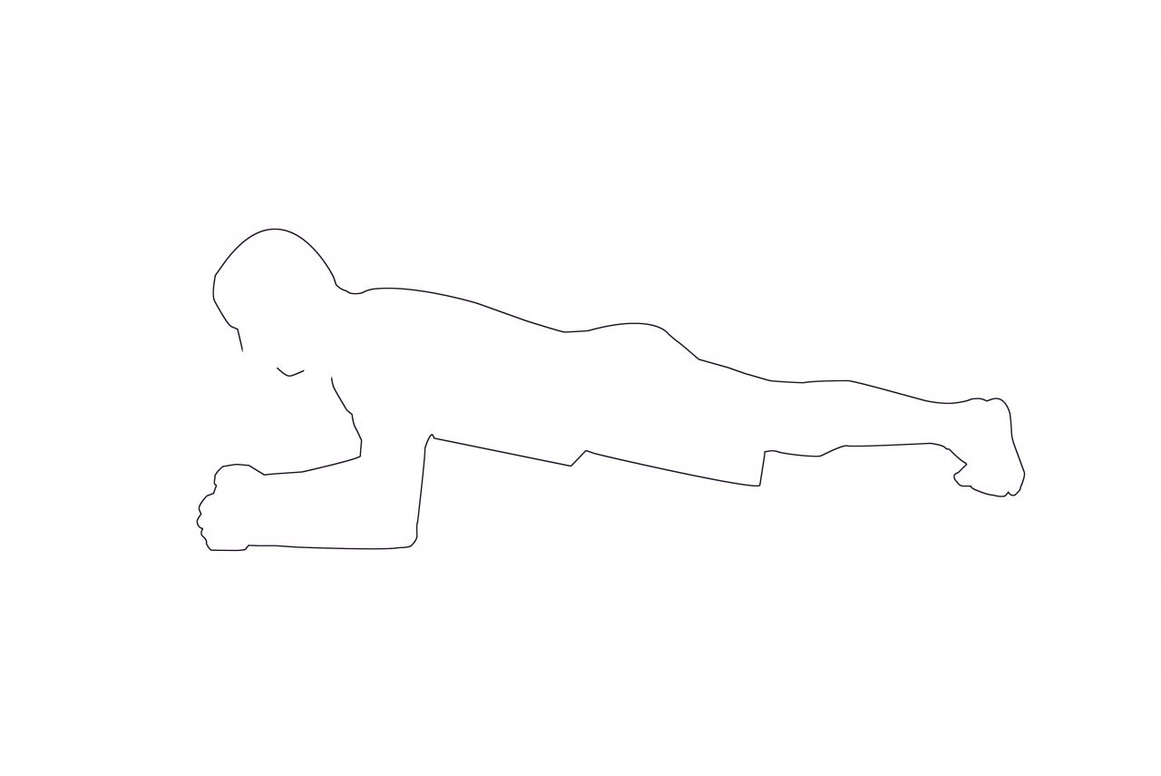 Lie face down on the ground and push your body off the floor so you are resting on your toes and forearms with your shoulders directly above your elbows. Keep your back flat and in a straight line from your head to your heels. Tilt your pelvis forward and contract your tummy muscles so your bottom doesn’t stick up in the air. Whatever you do, don’t hold your breath.