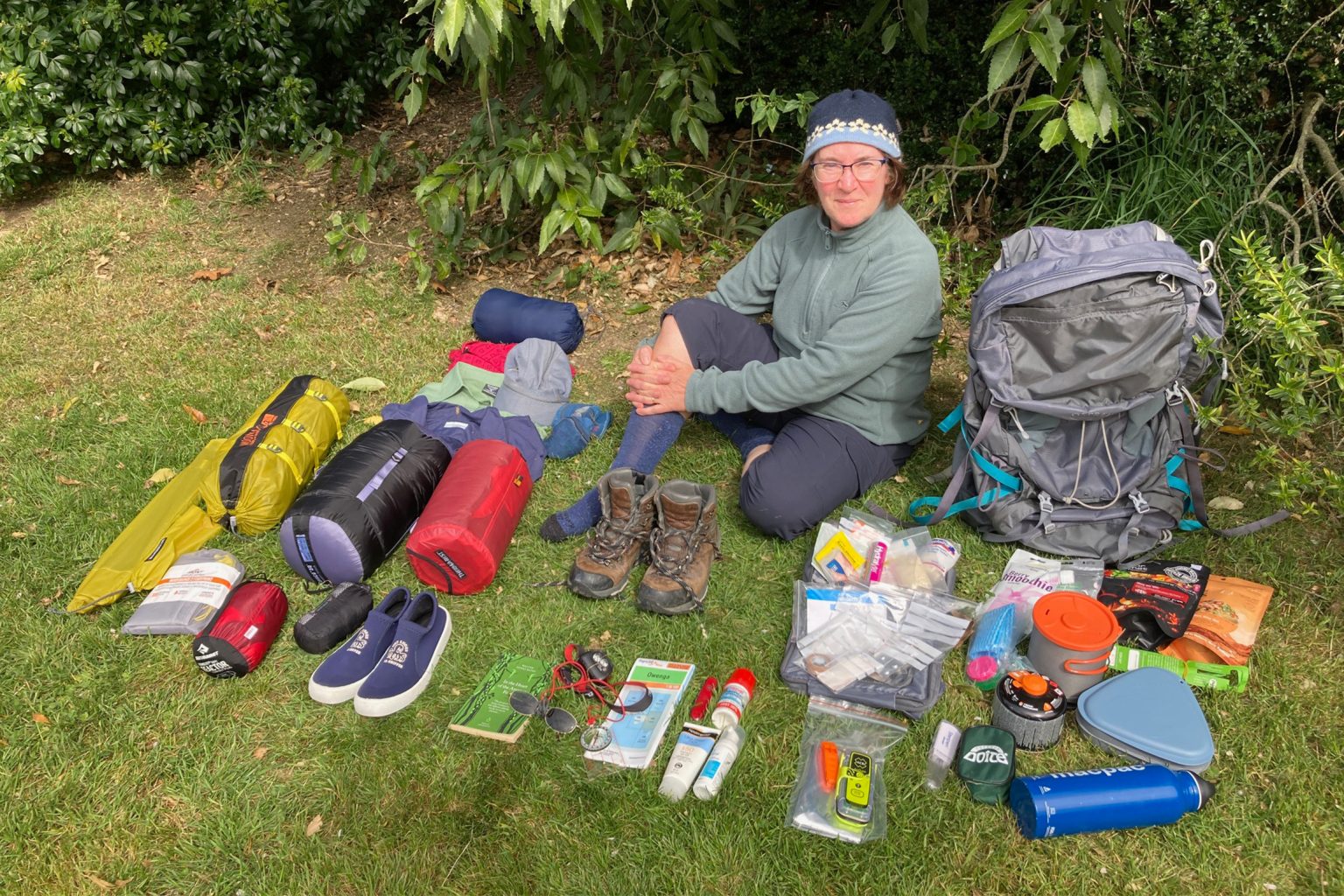 My pack is an Osprey women’s Aura AG 65 weighing 1900g. It’s the first pack I’ve had that is specifically designed for women and the harness is superbly comfortable, making the load seem much lighter. The multiple compartments are useful.