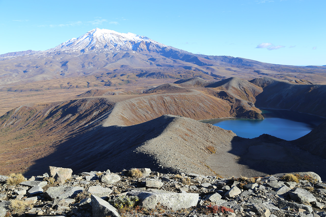 View over Upper Tama Lake to Mt Ruapehu. Photo: Matthew Pike