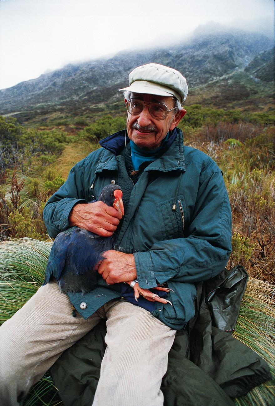 Geoffrey Orbell, aged 90, helping to release young captive-reared takahē into the Murchison Mountains on the 50th anniversary of his rediscovery of the birds in 1998. Photo supplied by Geoffrey Orbell’s Family