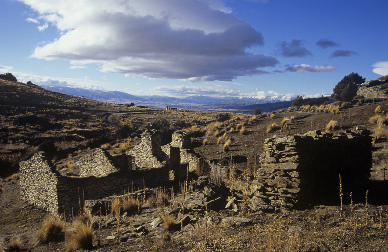 From the Matilda Battery site two routes lead to Welshtown, which is situated on a ridge a short climb ahead. The stone hut remains here must be among the best preserved in Otago and remain steadfast against the winds. You can almost hear the miners teeth chattering.