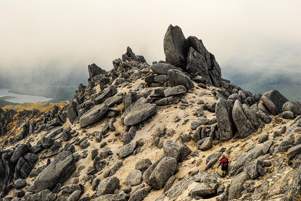 From Gertrude Saddle, we climbed slopes towards Barrier Knob in the Darran Mountains, and from the top looked upon Lake Adelaide, clasped among some of Fiordland’s higher mountains. Resting on the summit, I laid my hand over the coarse granite rock to feel its rough texture and sharp edges.