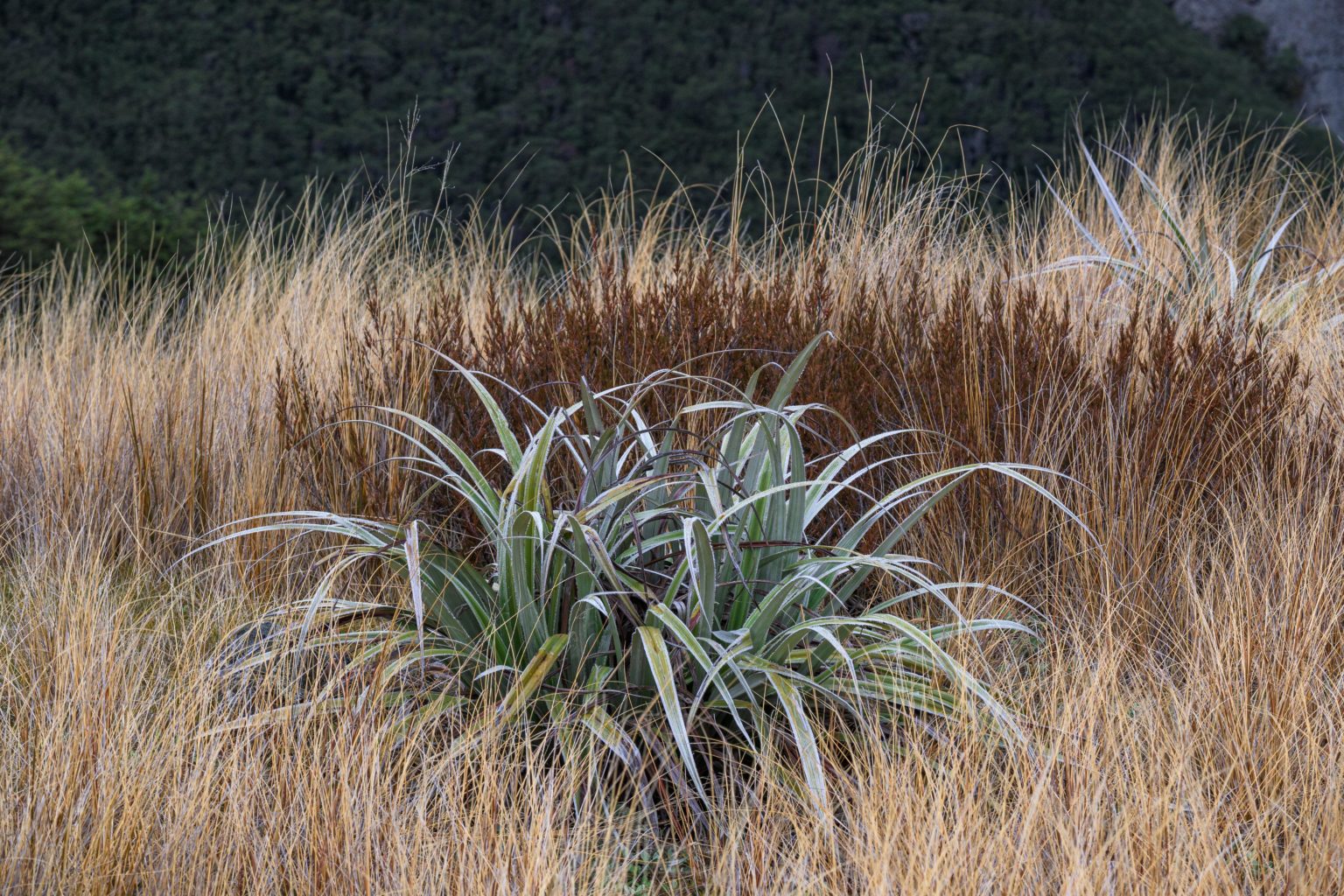 Over recent years, I’ve found myself drawn to photograph a distinctive plant that often makes a fine foreground: kakaha/mountain astelia. Superficially flax-like, this plant often makes attractive splays among the tussock, its long, pale leaves offering a distinctive colour and texture against its surrounds. In fact, the cultivated varieties sold in garden centres are often marketed as ‘texture plants’. And while they aren’t particularly showy, in the fruiting season their bright orange or red berries offer an additional splash of colour.