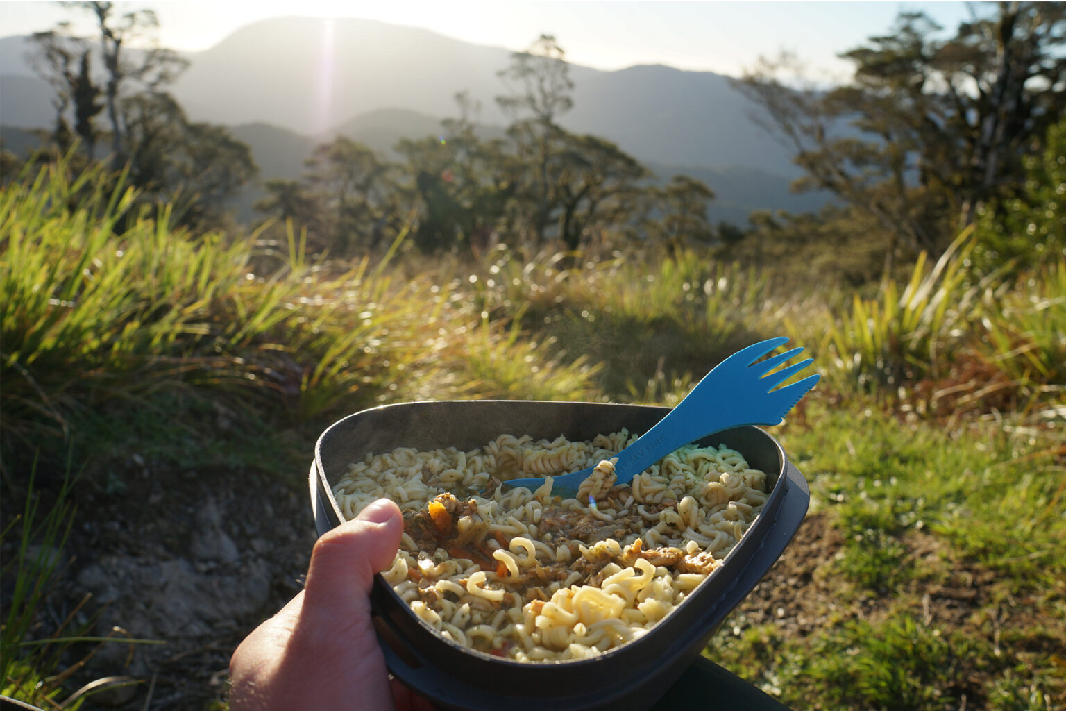 An easy backcountry buffet is the humble noodle. It’s lightweight, and all that’s needed to be done is add hot water and stir in the sauce for a carby meal that’ll keep you warm and fuelled.