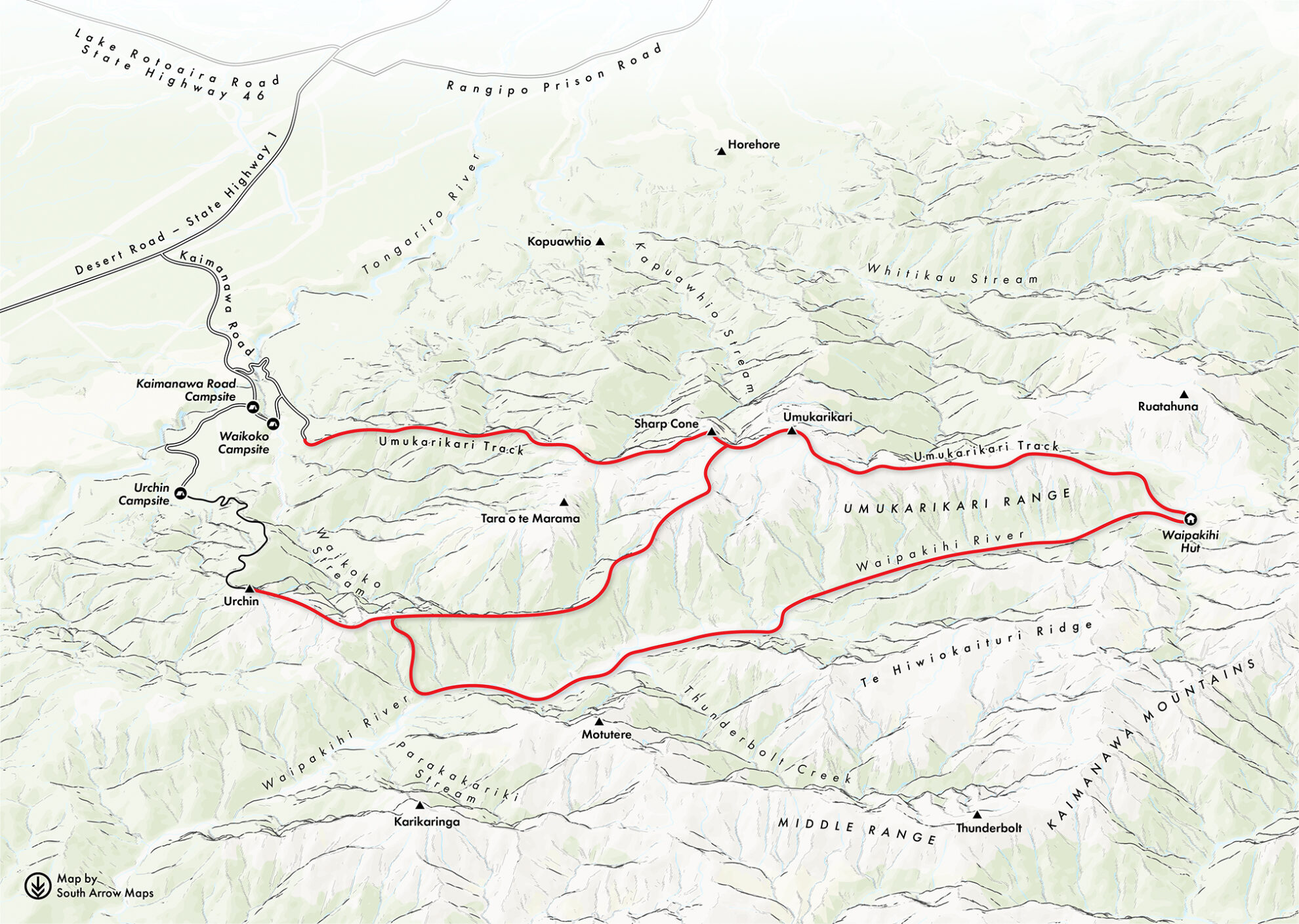 As I crawl into my sleeping bag, I ignore that voice and write in my diary and look at the map. The last time I’d crossed the Umukarikari Range came at the end of a Kaimanawa traverse more than a decade ago. This time the plan was to follow a poled route over the ridge connecting the range with Urchin, a peak to the south. Then to drop into the Waipākihi River, follow it up to Waipākihi Hut, and exit back over the Umukarikari Range. A fairly straightforward three-day tramp with tops, river, and bush. Mostly on poled routes, but with some off-track travel in the valley.