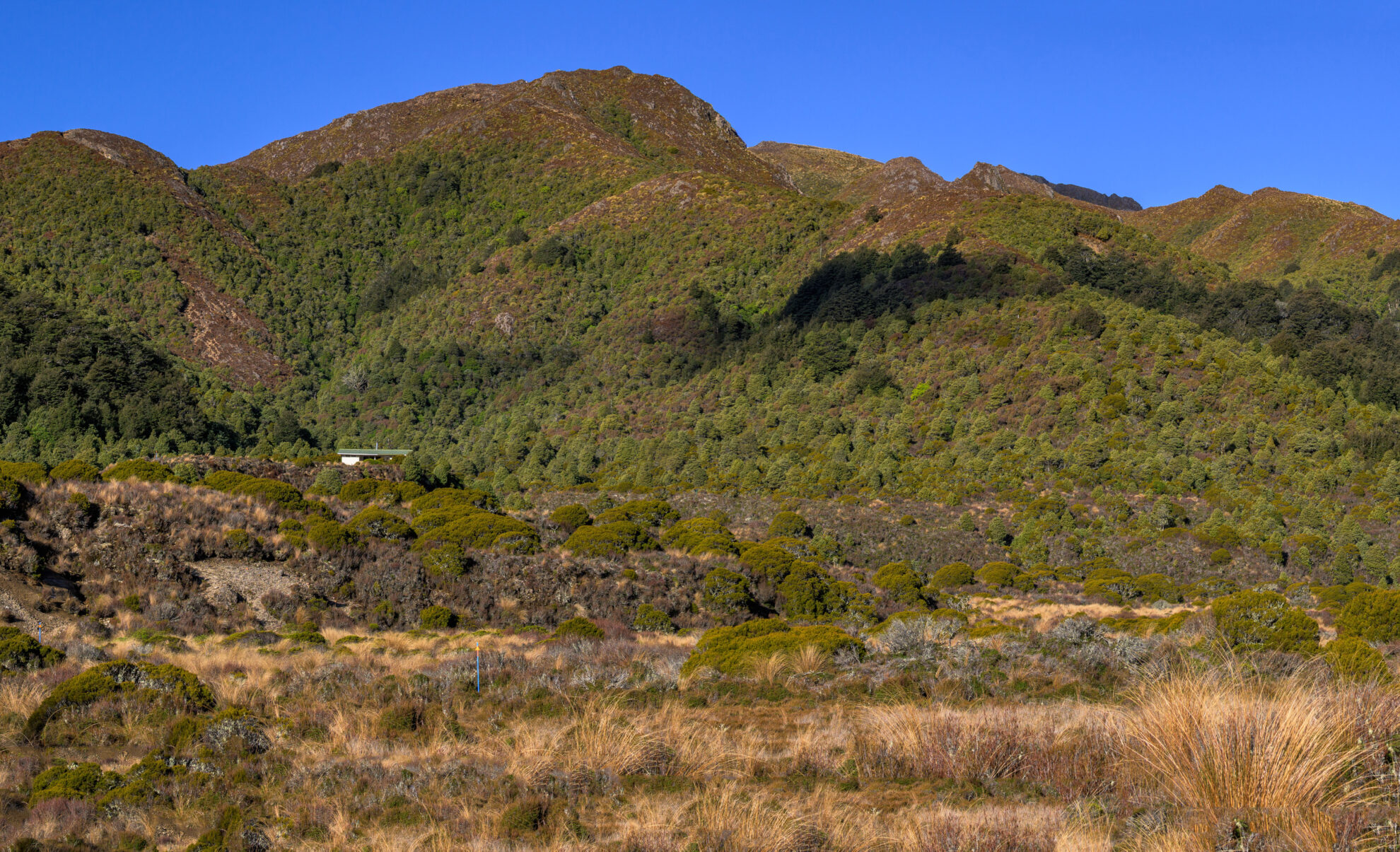 Back on the main track, I climb towards Sharp Cone, which seems an exaggerated name for such a benign peak. The route I’ll follow branches off the Umukarikari Range at a signposted junction between Sharp Cone (1481m) and Umukarikari (1591m). I take an off-track shortcut that avoids three-sides of a square, and cross a fledgling creek, so take advantage of the water and boil the billy. This is more like it; I’m in the zone, enjoying this solo gig, revelling in a tramp at my own pace and on my own terms.