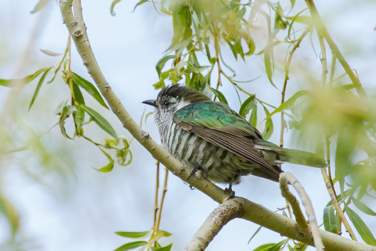 The distinct, recognisable feature of the cuckoo is its iridescent dark green back and wings. It also has lovely dark green horizontal bands on a white chest. The first indication that one is nearby is usually a loud, short, upwardly-slurred whistle repeated several times and ending with a much longer downwardly-slurred whistle. However, they can be very difficult to track to source, with the bird regularly remaining concealed in dense foliage high in the tree tops until put to flight.