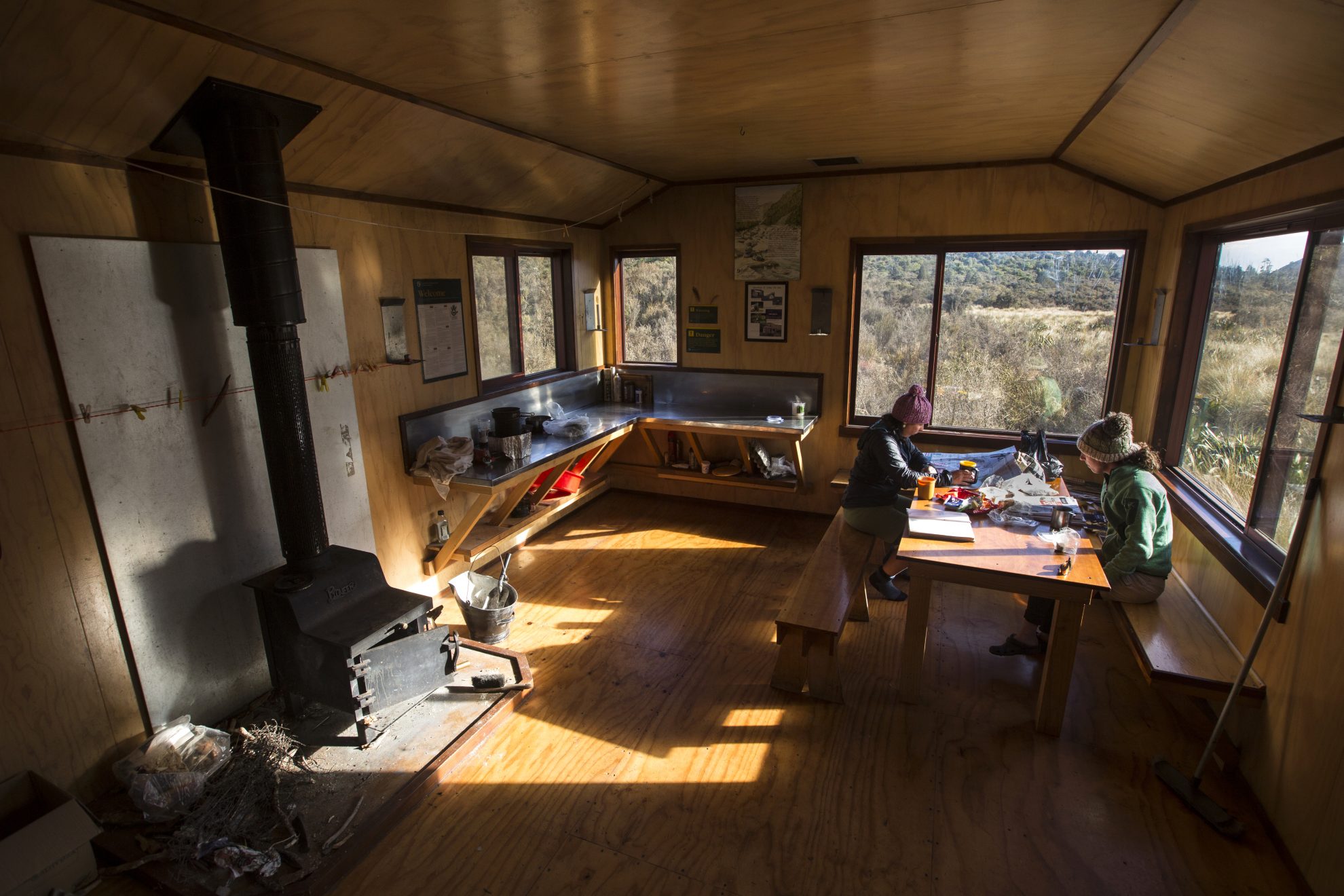 Lower Arahura Hut is easily accessible – possibly to its detriment. There were small piles of rubbish around the hut and down the loo, a stack of dirty billies outside and personal gear stashed under and around the bunks inside. There was also no dry firewood and though the hut is double-glazed, the pitiful fire we were able to kindle struggled to keep the winter frost at bay. We did our best to tidy up and stacked some firewood to begin drying before we left the next morning.