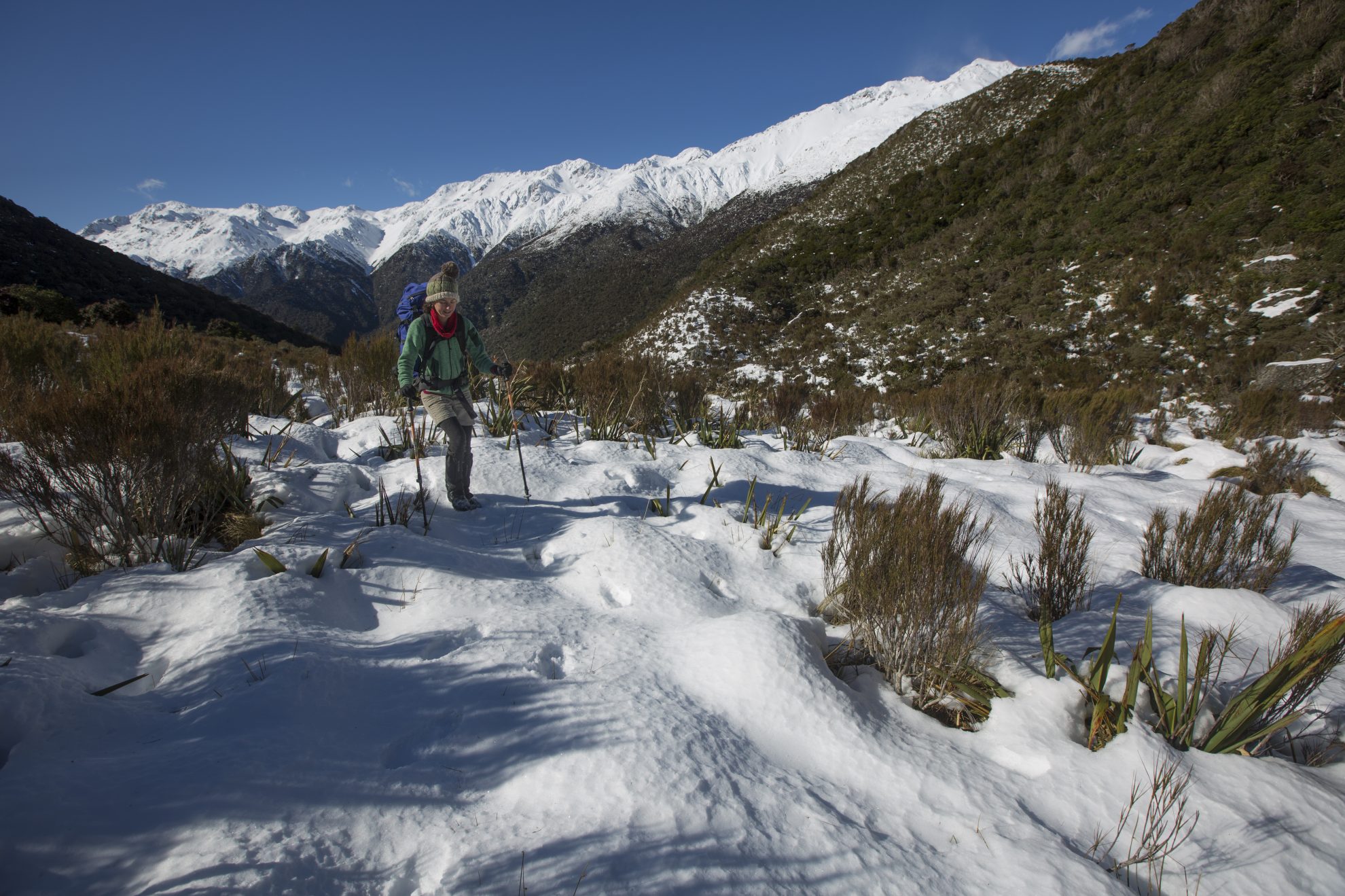 We’re hopping from one tussock marshmallow to another as we cross Styx Saddle and every third hop or so sees one of us plunging through the crust into knee-deep snow. It’s mid-winter and freezing, but there ’s no place I’d rather be.