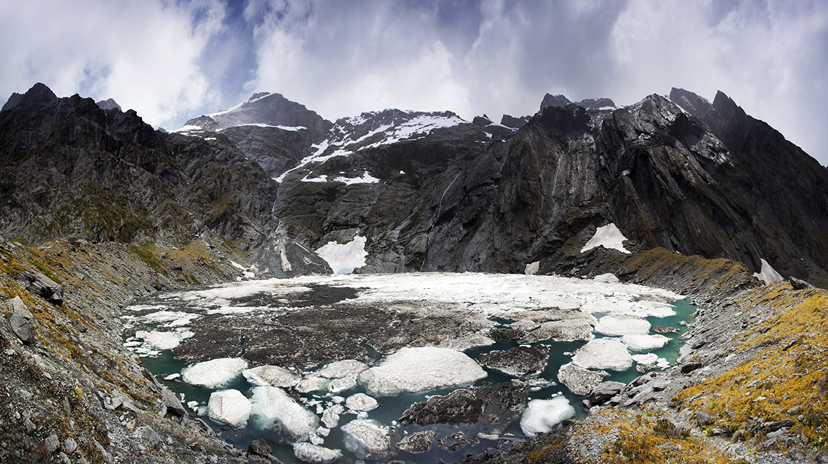 Topping out, we gasp in amazement at the jaw-dropping, raw beauty of Crucible Lake, an aptly-named circle of teal-blue melt-water cluttered with icebergs; some glistening white, some dirtied with recent rock debri. Mt Alba appears through the mist, its brazen black ramparts sliced with a single silver thread of falling water draining the Axius Glacier. We drink in the monochrome world of grey cloud, black rock, and white ice. A hailstorm hits hard, so we scurry away like ants.