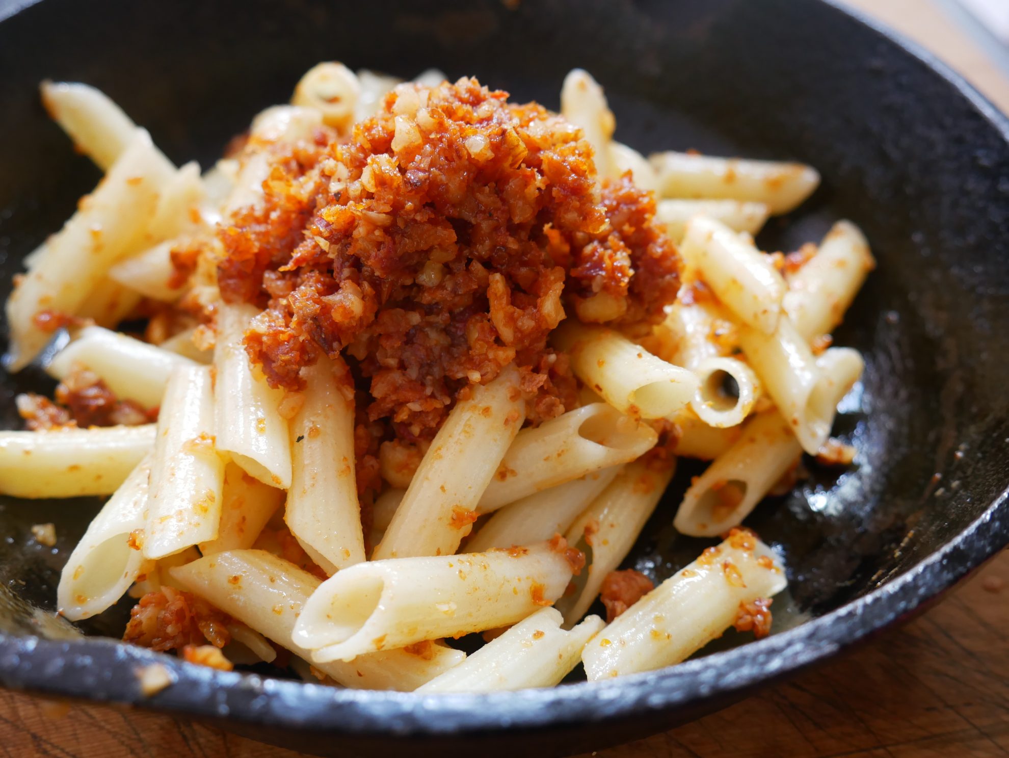 In a food processor, combine sun-dried tomatoes, oil, garlic, nutritional yeast and roasted almonds. Pulse until mixture is well combined but still slightly chunky. If it looks dry, add extra oil. Taste and season with salt. Store in an airtight container. It should last up to a week in the fridge or 2-3 days out of it. To serve, cook pasta as per directions on packet and then stir through pesto. Top with a handful of toasted almonds for extra crunch.