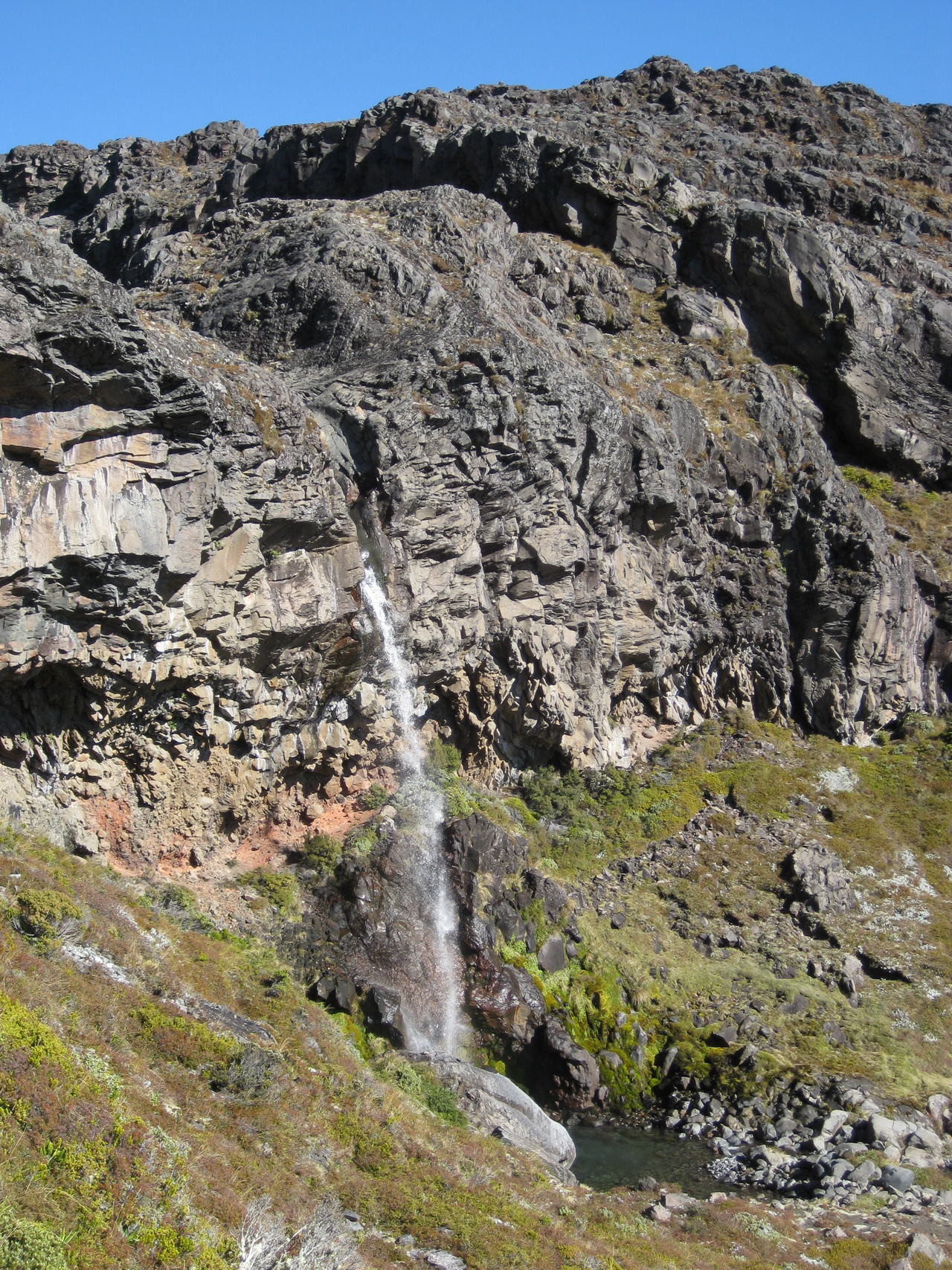 Time to move on, briefly south-southeast, and then down a steep slippery slope through bluffs to the headwaters of the Whakapapaiti Stream: a magical area with waterfalls tumbling, and the scenery a major distraction from the task in hand – remaining upright and keeping one’s footing on the loose stony slope. My companion, who describes herself as more a walker than a tramper, remained unusually silent.