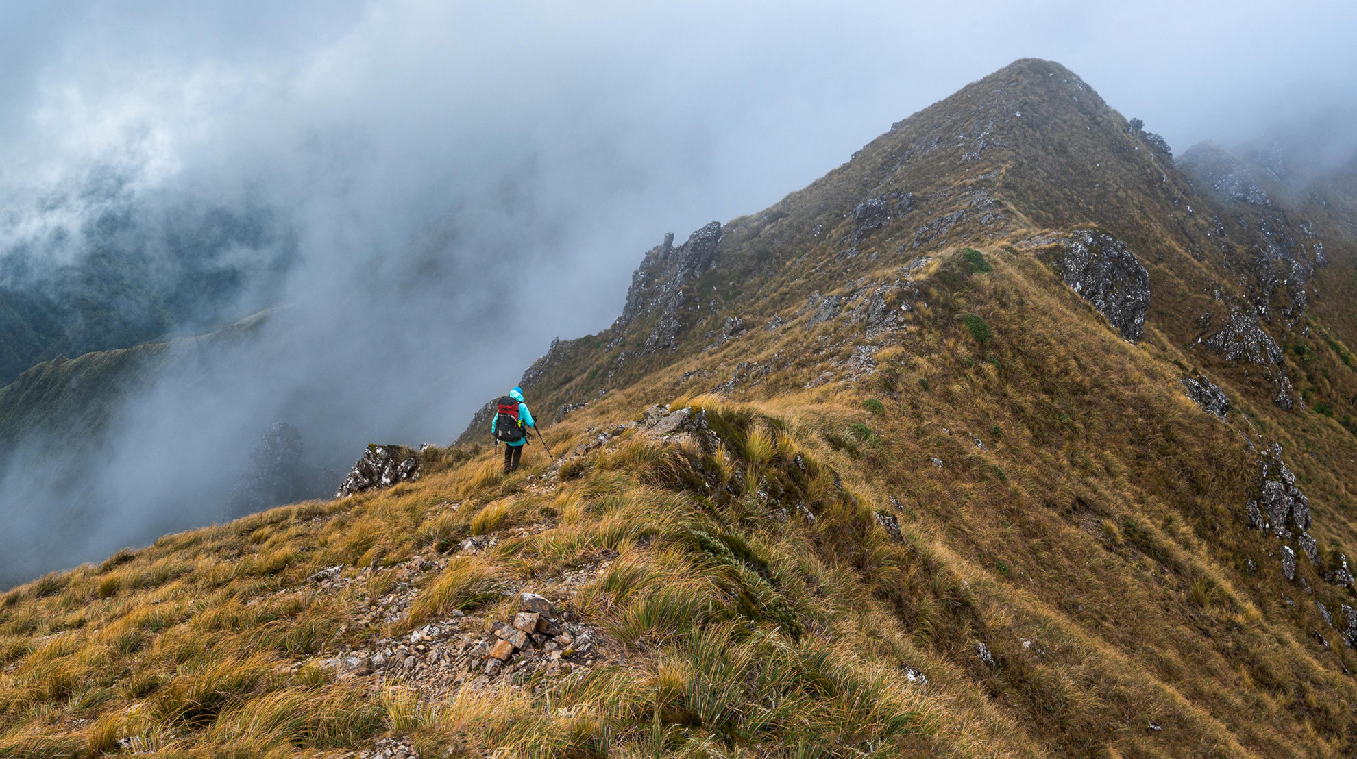 We set off along the untracked ridge, which disappears into cloud. I clasp my compass, following the bearing into nothingness. Sporadic cairns offer assurance and there’s a faint but discernible ground trail. Soon the cloud lifts a little, offering better visibility. A shimmer of blue hints at open skies not far above. I feel my heart lift, my confidence grow. We might even get a view.