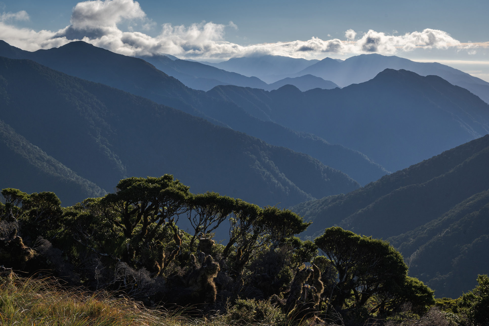 Much of Neill Ridge is covered in gnarled silver beech forest, so moss-enveloped that in places no bark shows at all; a tracery of unrelenting green.