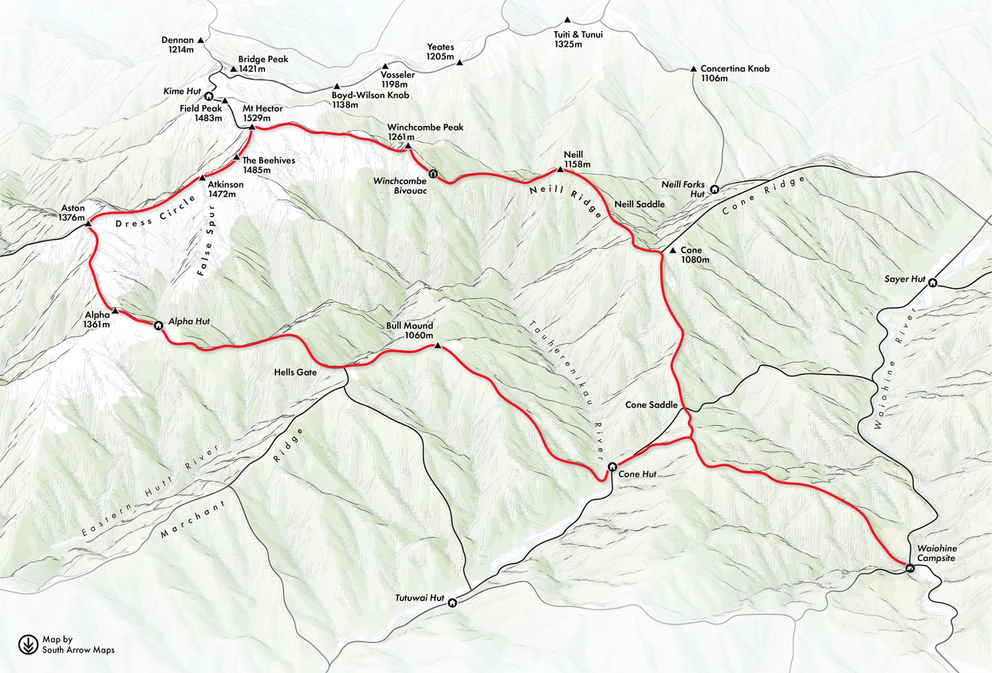 The ridge traverses a number of torturous knolls, the highest being Neill and Winchcombe, gradually rising to narrow tops where trampers must navigate around precipices until they broaden, shortly before culminating at Mt Hector. Combined with the Southern Crossing, the ridge forms a satisfying three to four day circuit, beginning and ending at Waiohine Gorge Road.