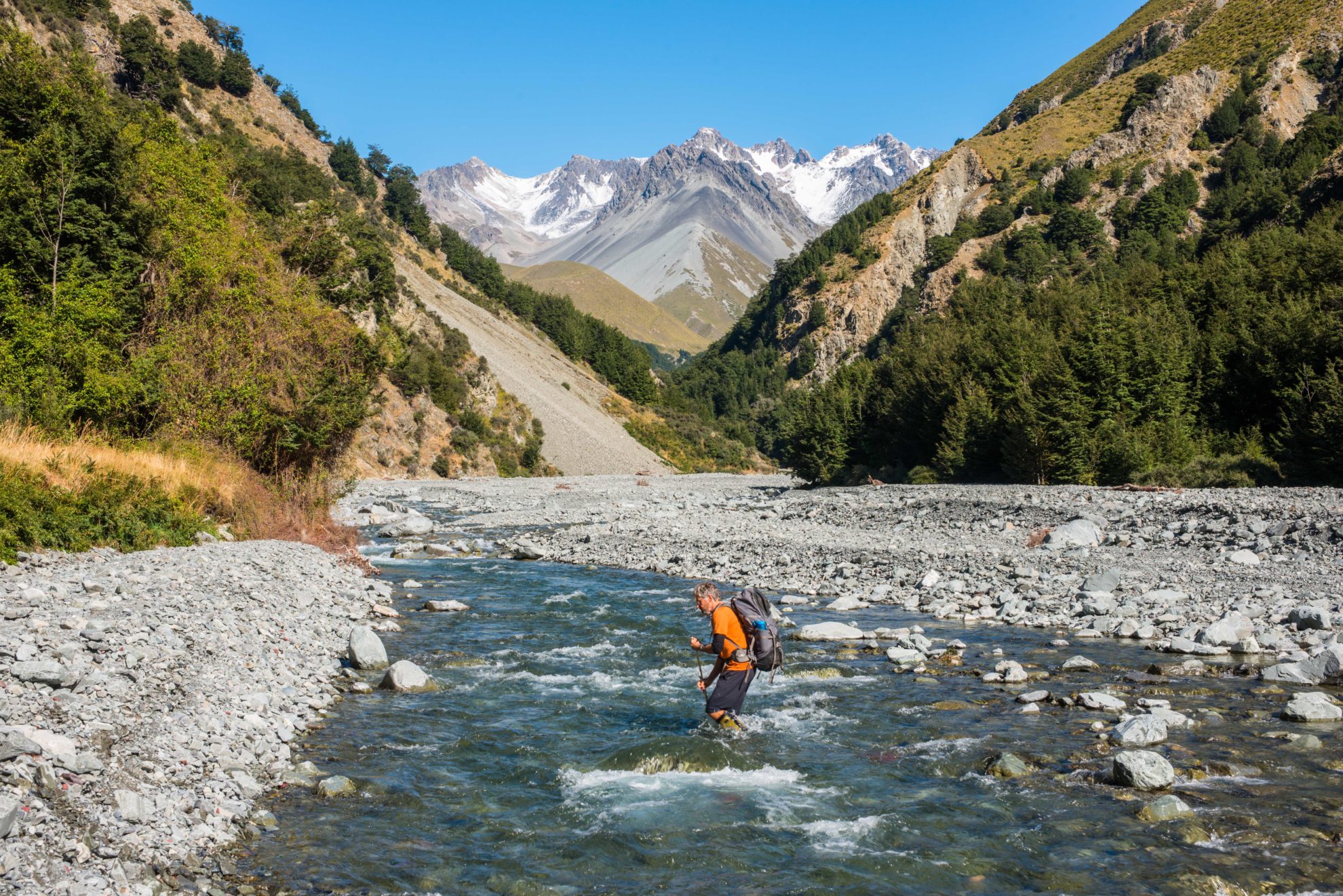 The ubiquitous nor’wester was howling out of the maw of the Rangitata as we set off, sending powerful dust storms across the barren riverbed gravels. We hunched into the gale, steering a course for the canyon of Black Birch Creek.