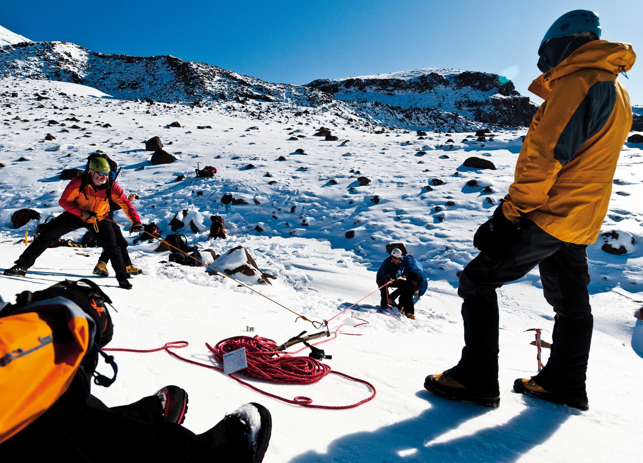 Matt Bennett, Training Manager with the Sir Edmund Hilary Outdoor Pursuits Centre, coaches a group of New Zealand Alpine Club volunteer instructors in destruction-testing snow anchors.