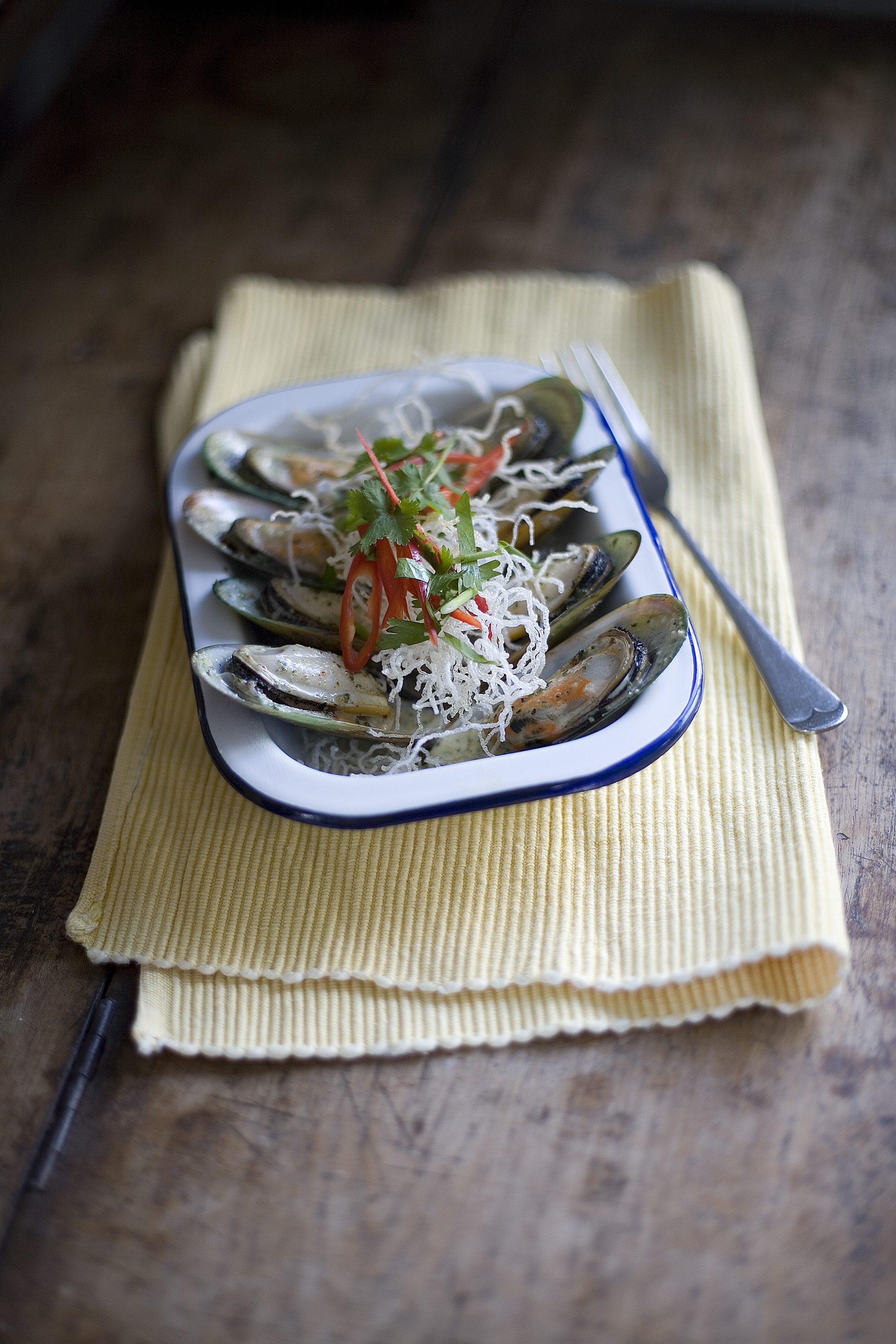 Remove one side of the shells, add a teaspoon of the coconut cream and herb mix then serve immediately with some finely sliced chilli, spring onions and coriander leaves to garnish.