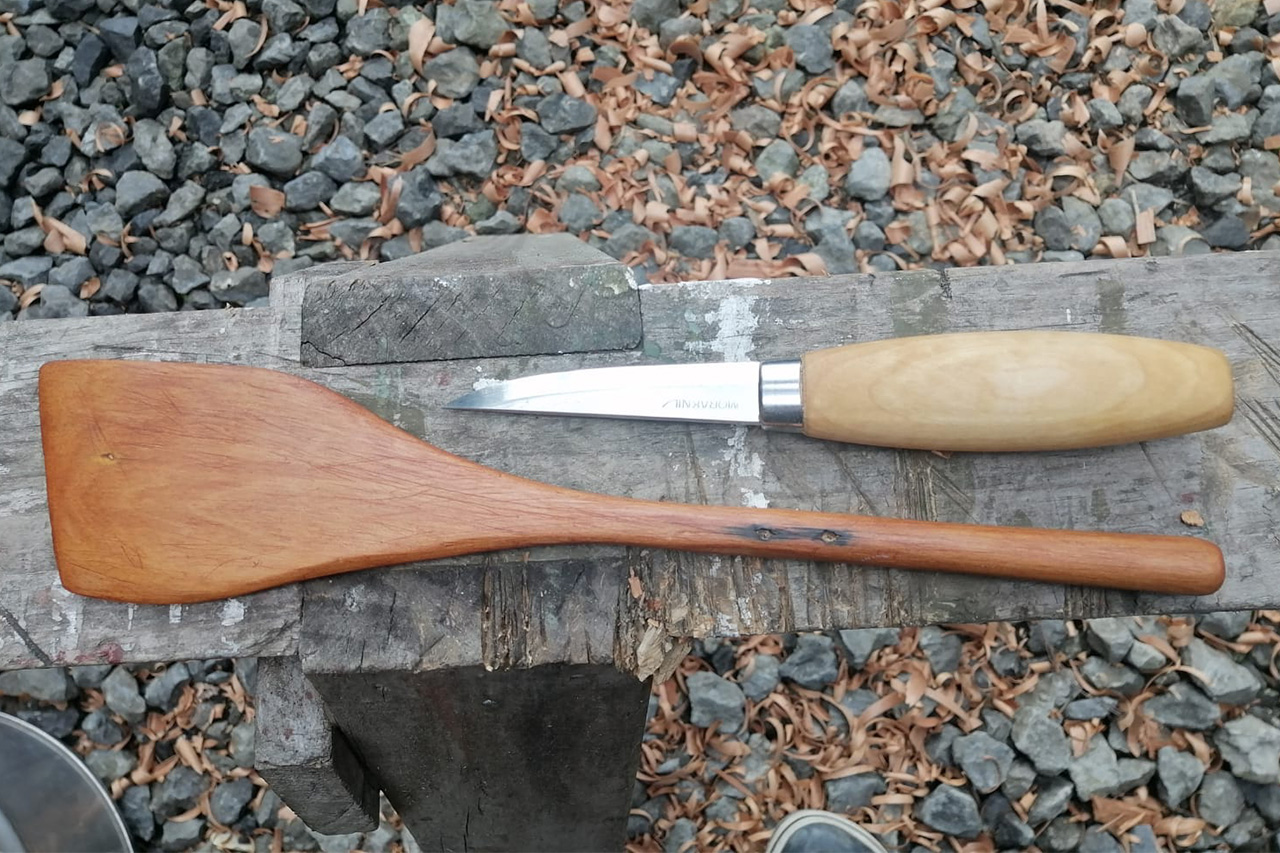 I was surprised how easily the whittling knife sliced through the totara. As with tramping; safety first and full concentration is required. I still have five digits on each hand after finishing the spatula, which is convenient for the next whittling project.