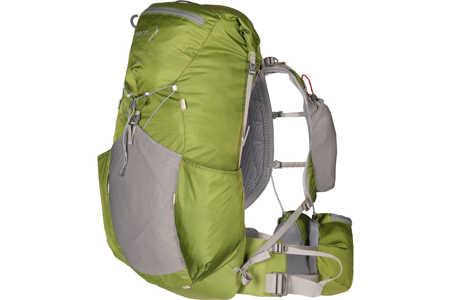 This framed pack combines body movement, balance, stability and instant gear access. There are two shoulder-strap mesh bottle pockets and built-in Hip Balance Pockets. It uses the U-Flow harness system with a mesh air gap backpanel. Pole and ice axe attachments. Capacity 30l Weight 810g. www.aarnpacks.com