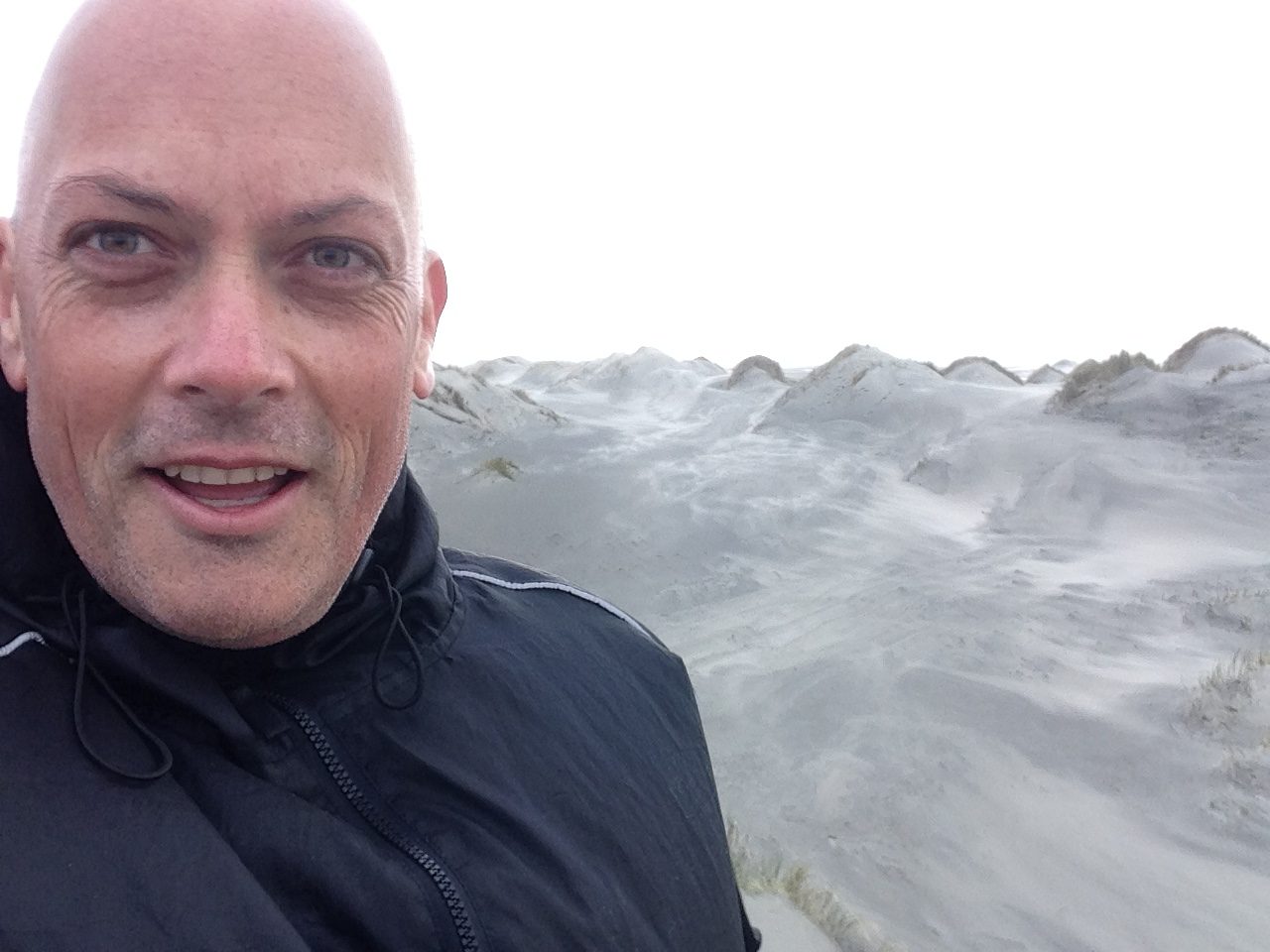 Heavy winds whipped up the sand dunes to blast Hoskin’s face, and the rain – now unfrozen – pelted down.