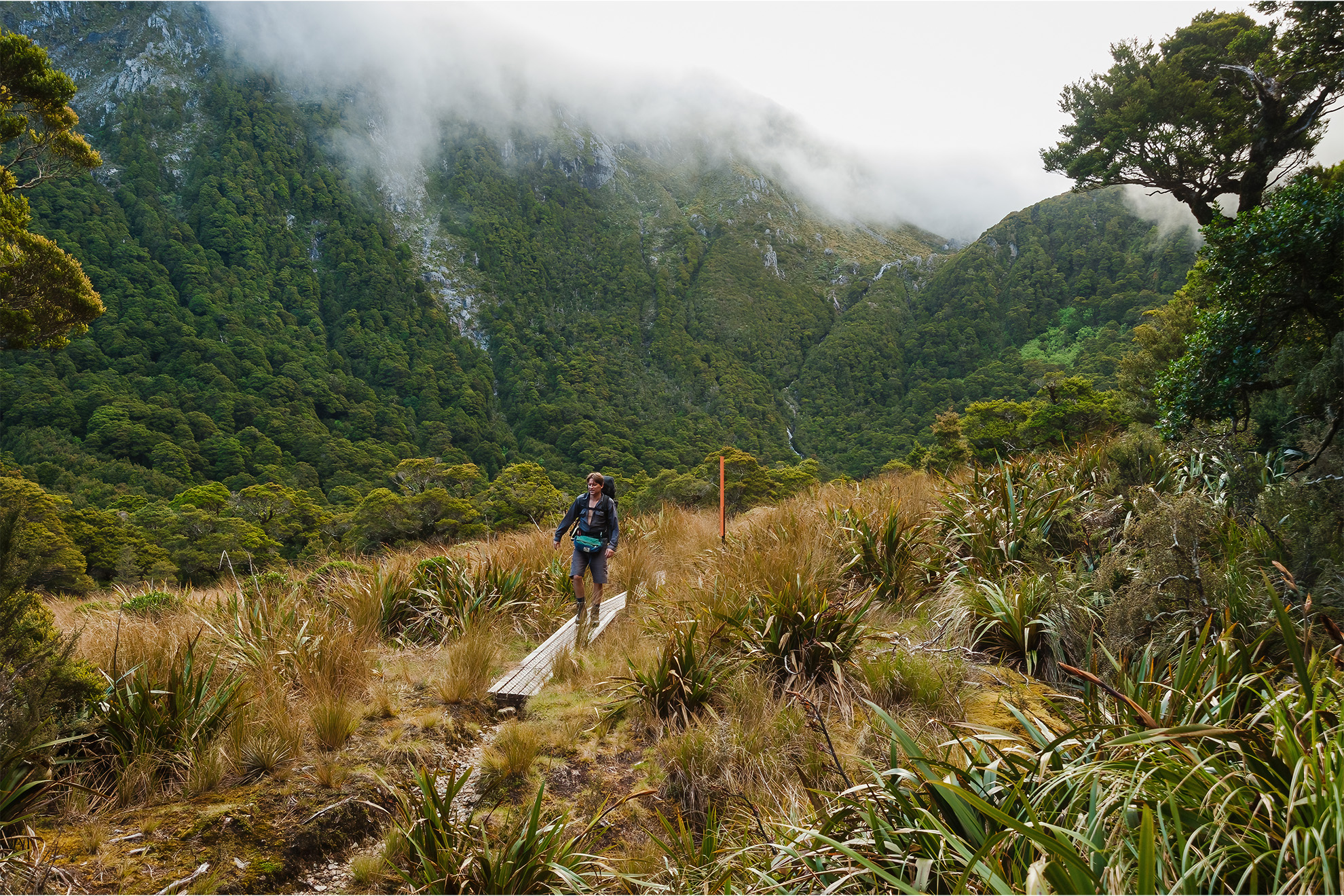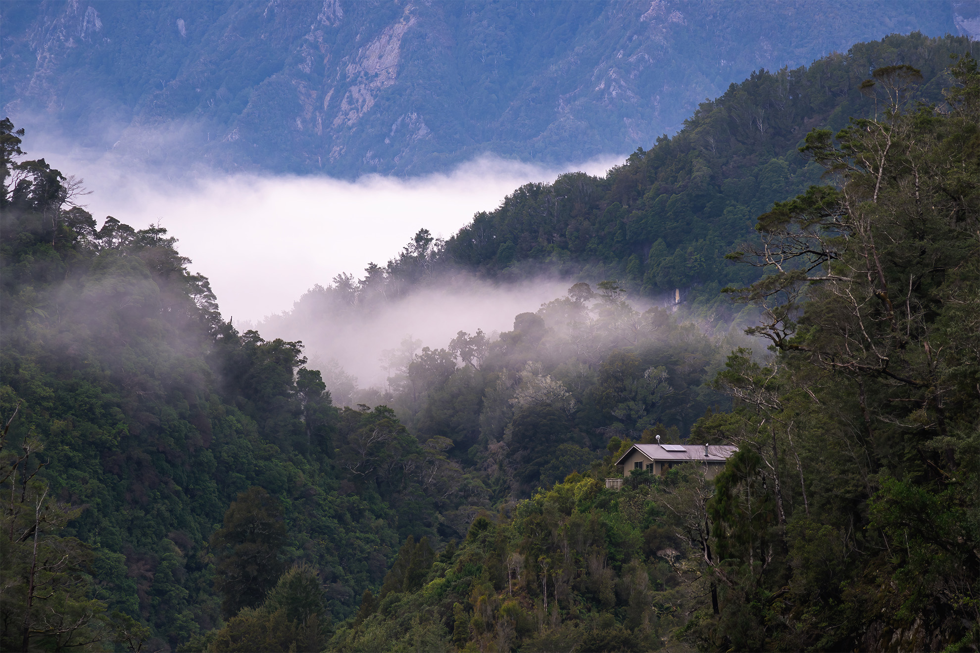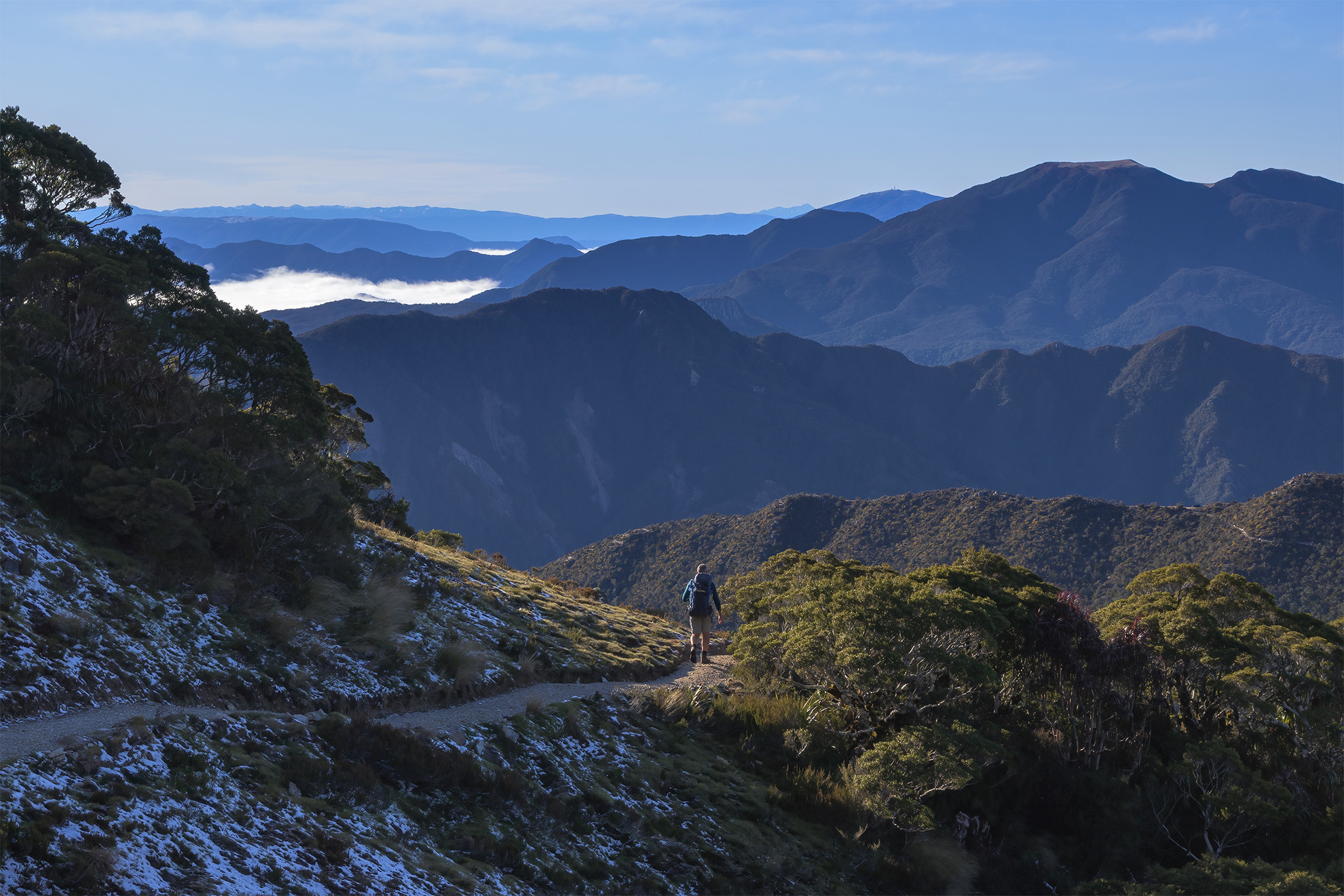 To the southeast the great arc of the northern Kā Tiritiri o te Moana stretched to the southern horizon. Inversion cloud, snaking around spurs and copses of beech trees, clung like small glaciers in hollows and valleys.