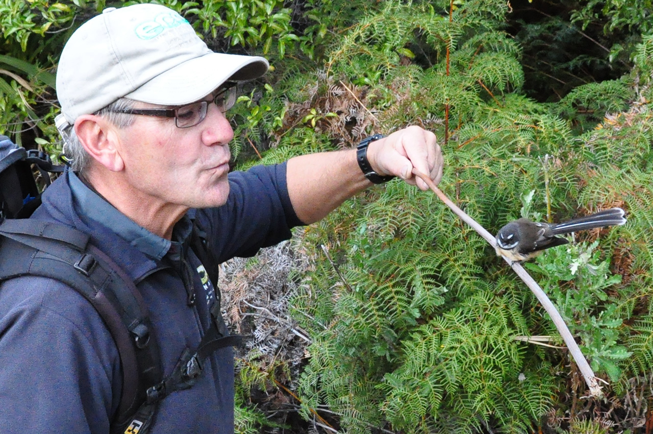 He recalls planting it with a young visitor a decade ago, and as three piwakawaka flit into view, he emits a passable imitation and extends a branch – to my surprise, the bravest of the birds touches down for its photo opp.