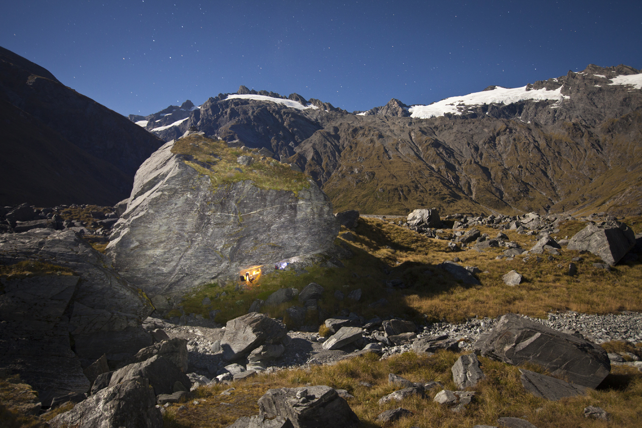 For several years a Mt Cook topomap had adorned my wall at the New Zealand Alpine Club offices. West of the Divide and alone on a remote moraine flat at 1200m sat one of those ‘bowler hat’ dots denoting a rock bivouac. Titled Harper’s Rock Biv, this spot of black ink, incongruous among the map’s lines of orange and blue and far from the green, tempted me. A remote refuge for generations of transalpine visitors, the bivouac was first discovered by AP Harper – one of the co-founders of the New Zealand Alpine Club – in the early 1890s.