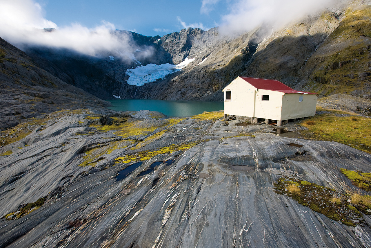 Ivory Lake Hut is perched on the smooth rocky shores of Ivory Lake, high in the Waitaha River area of the West Coast. Built in the 1970s for hydrology and glacier research, the hut is a throwback to the simpler times of alpine exploration. Its furnishings are sparse, with just six bunks, a large dining table and a cooking alcove.